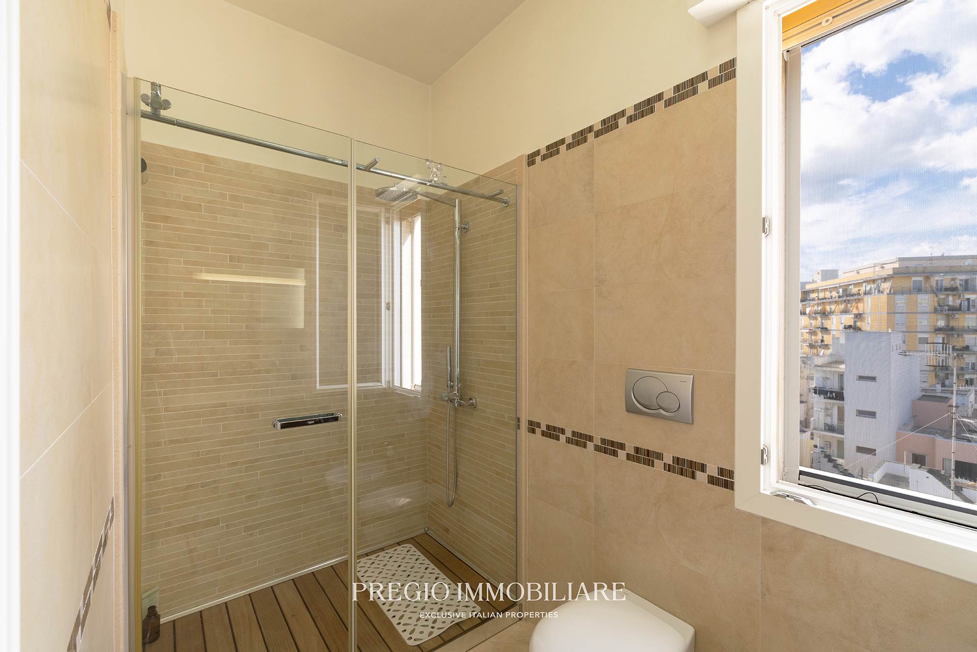 Elemento distintivo della proprietà è la terrazza di oltre 60 mq, con vista aperta e dominante sul profilo urbano e sul mare. Uno spazio privato e riservato, ideale per momenti di relax e convivialità in un contesto urbano di riservatezza.