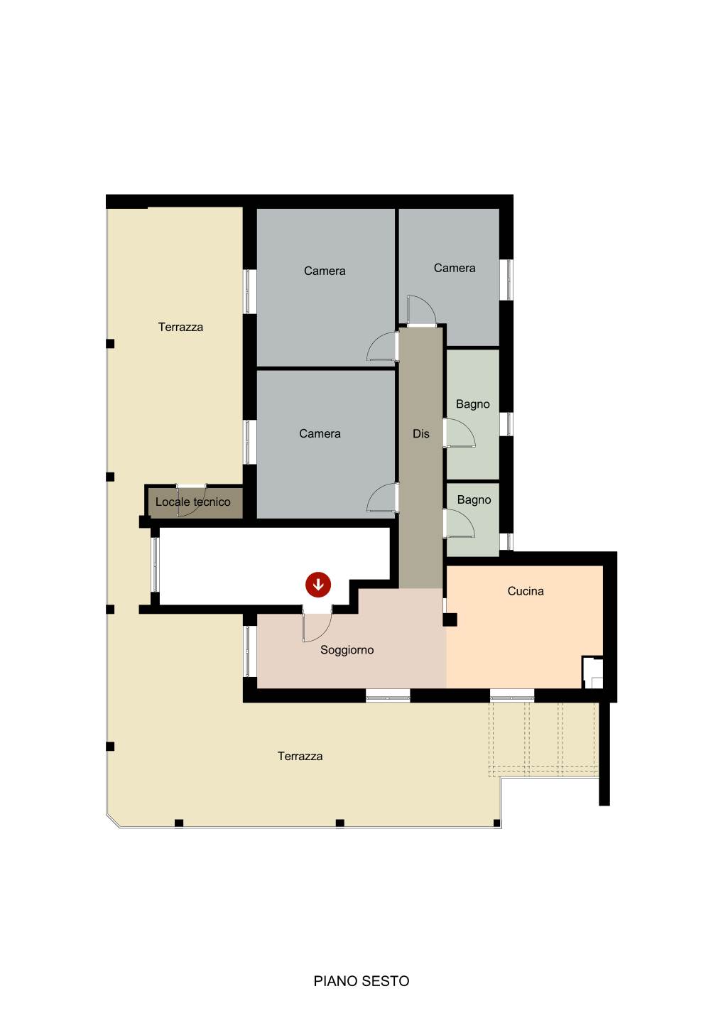 L’immobile si sviluppa su un unico livello e dispone di tre camere da letto matrimoniali, due bagni. L’ingresso introduce in un ampio soggiorno con cucina a vista, reso particolarmente luminoso dalle grandi aperture vetrate che collegano armoniosamente gli interni alla terrazza. L’esposizione tripla garantisce luce naturale in ogni momento della giornata e una piacevole ventilazione costante.