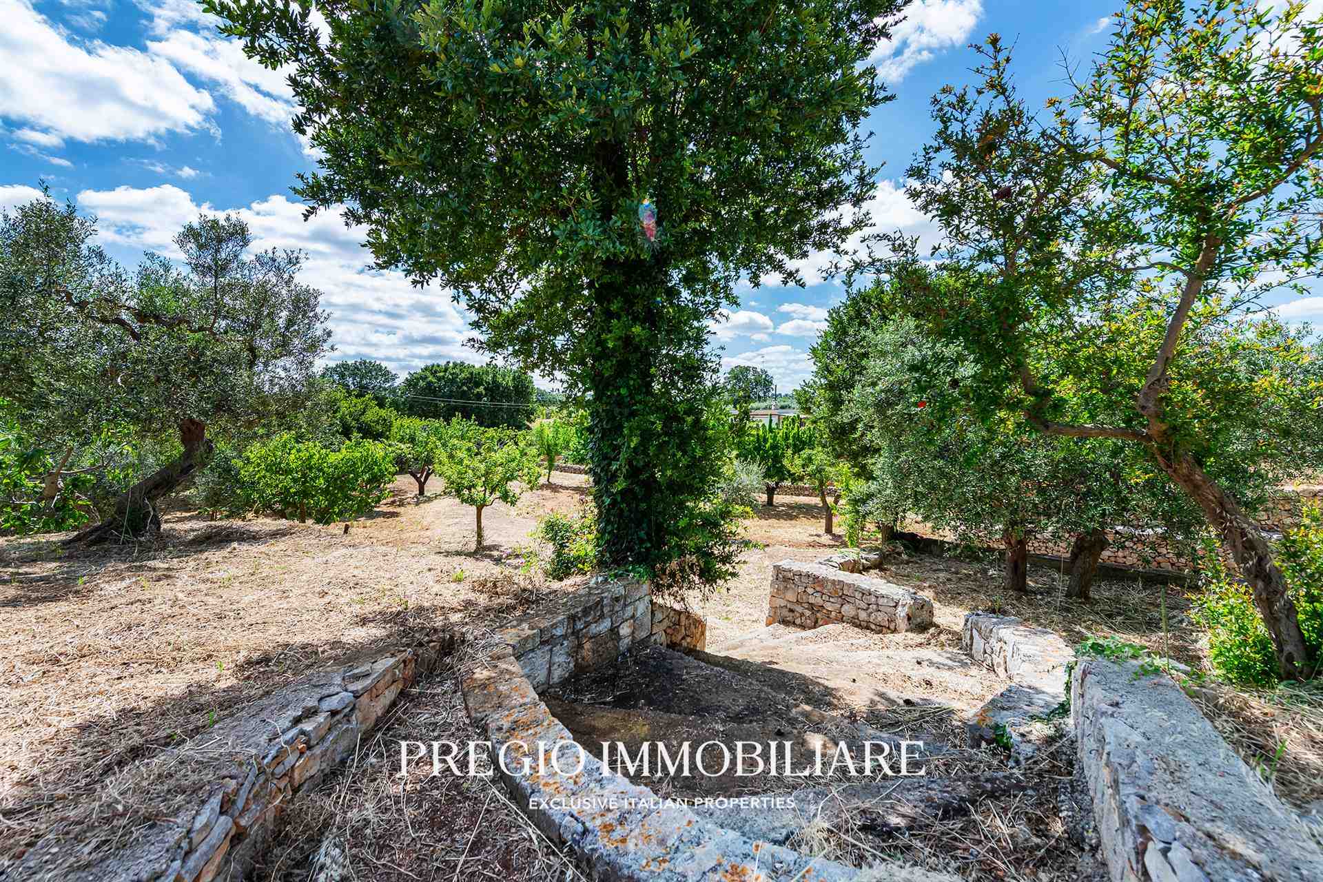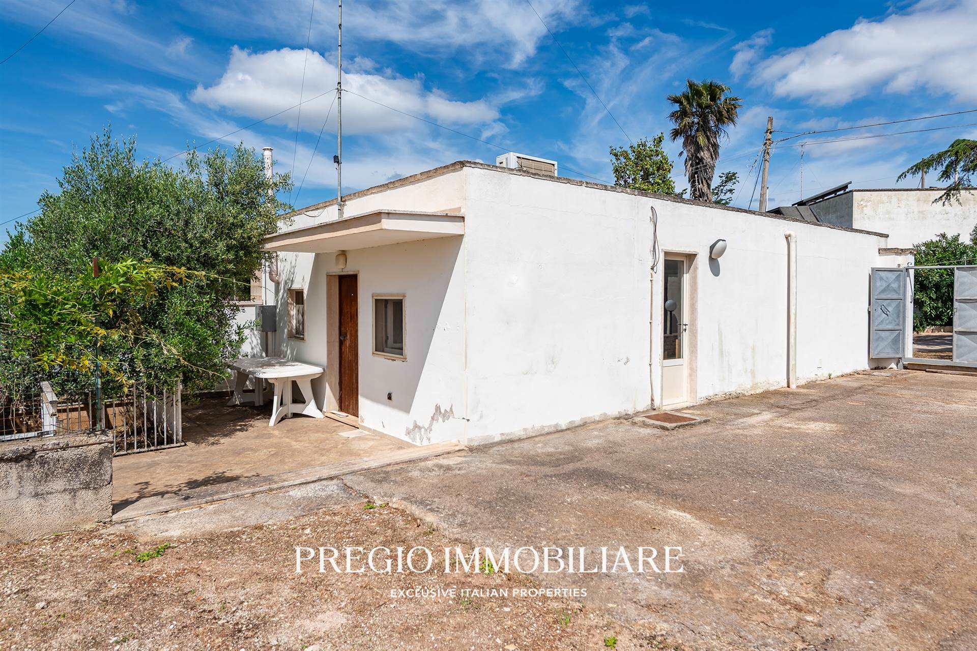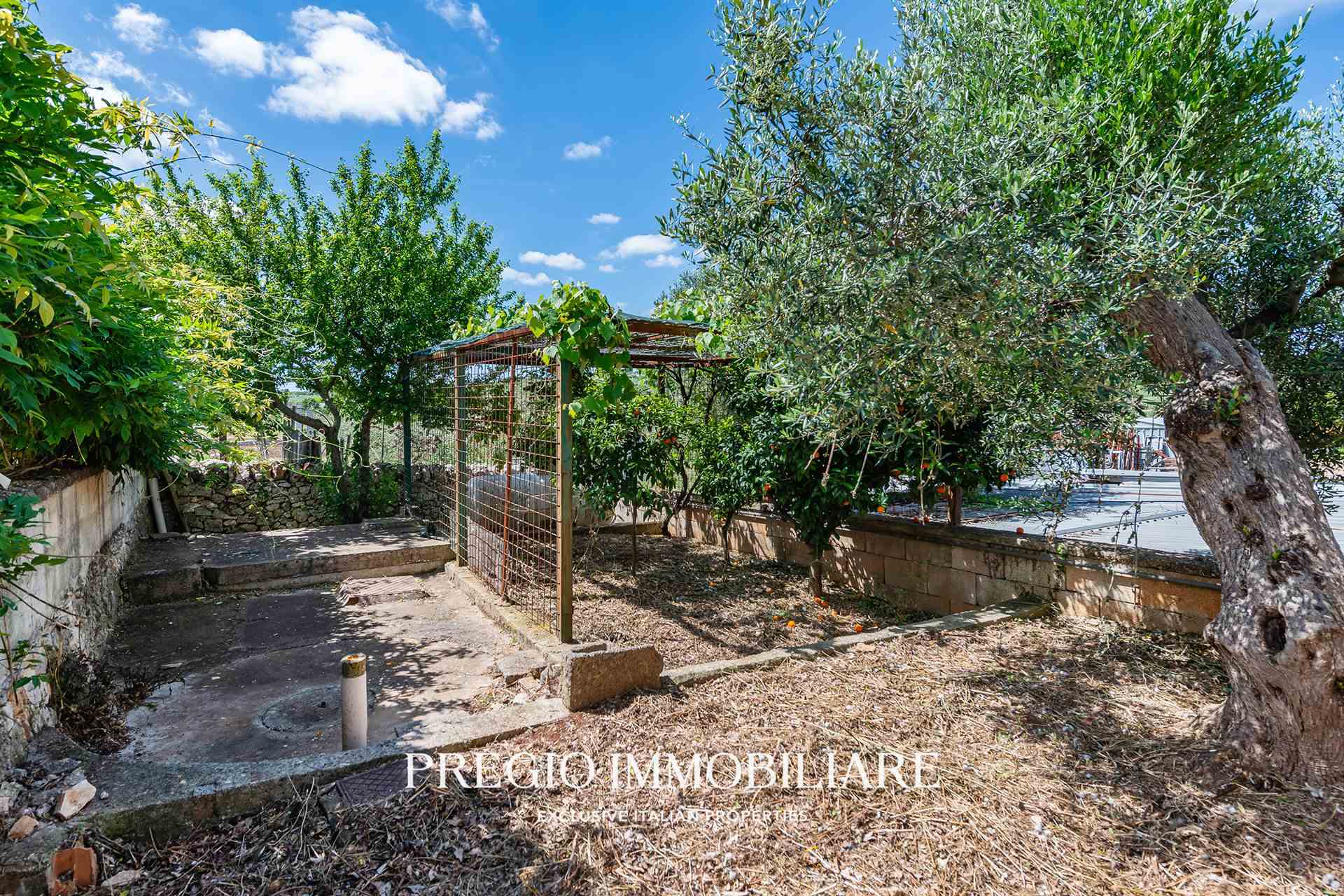 A completare la proprietà, due magazzini per un totale di 45 mq e un vasto terreno circostante, impreziosito da un rigoglioso mandorleto e uliveti secolari, simbolo autentico del paesaggio pugliese.