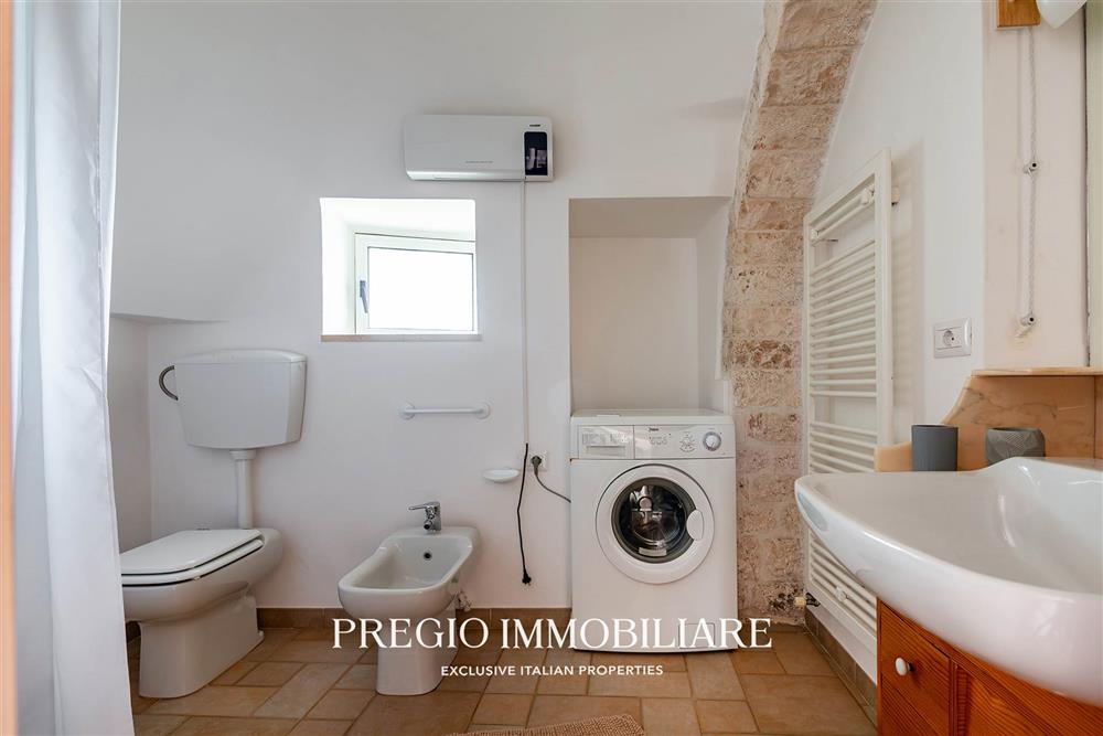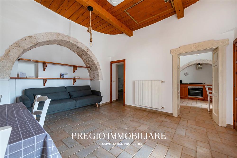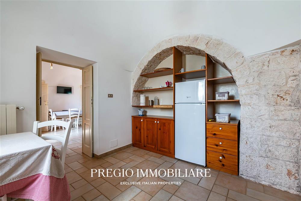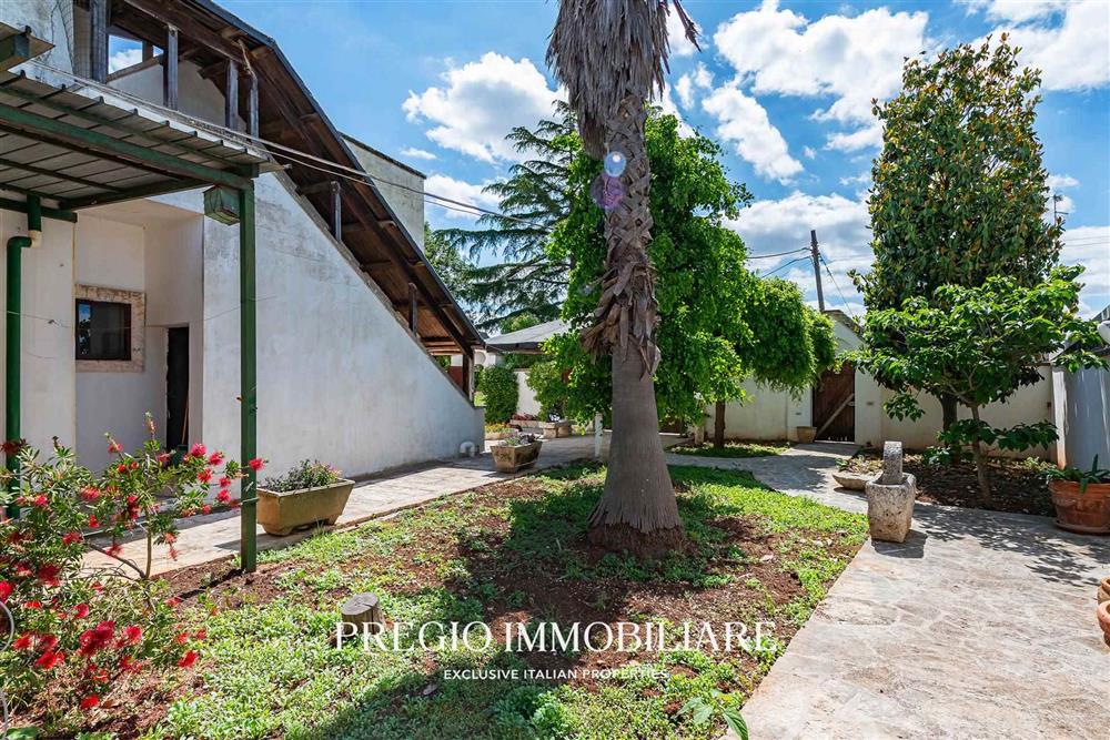 A completare la proprietà, due magazzini per un totale di 45 mq e un vasto terreno circostante, impreziosito da un rigoglioso mandorleto e uliveti secolari, simbolo autentico del paesaggio pugliese.