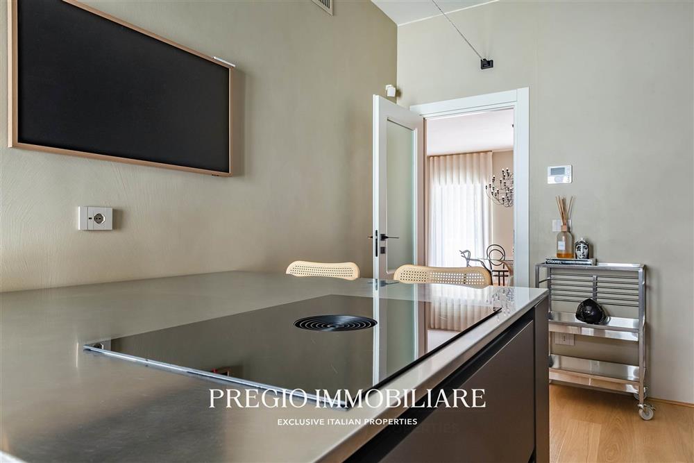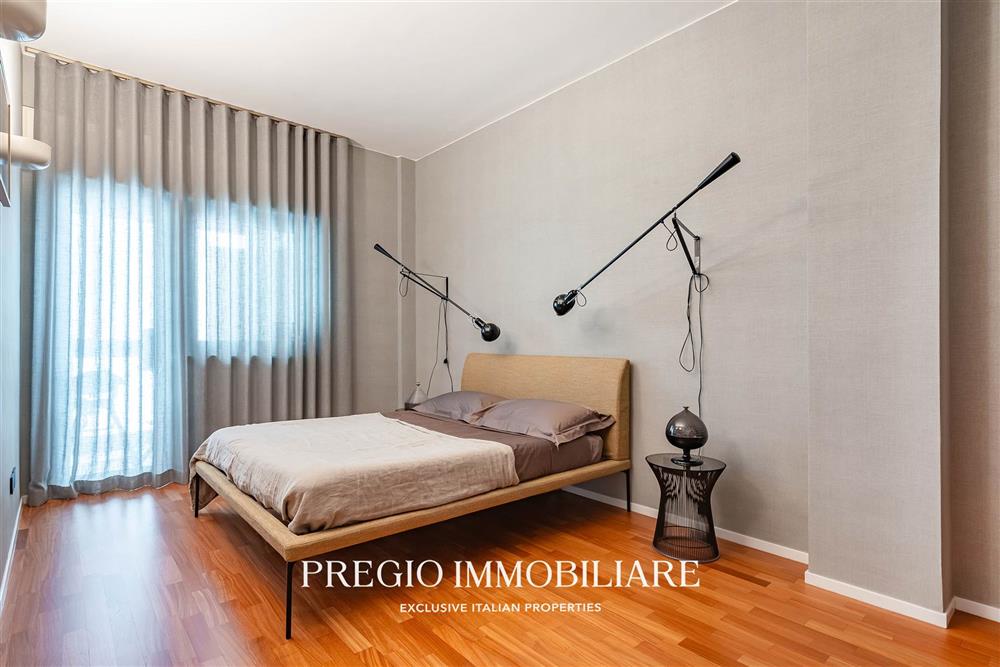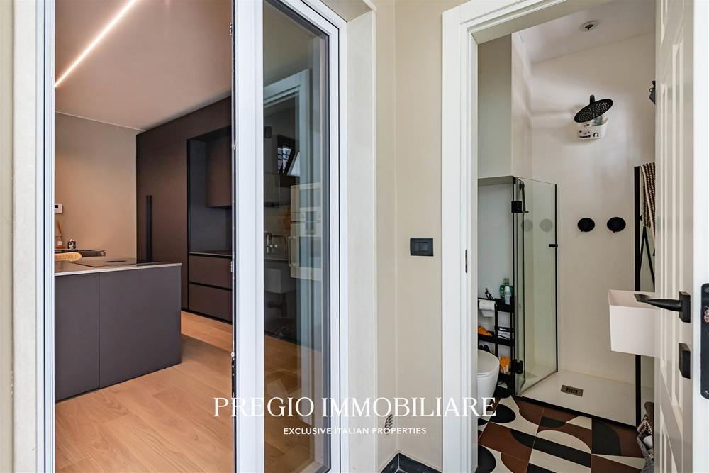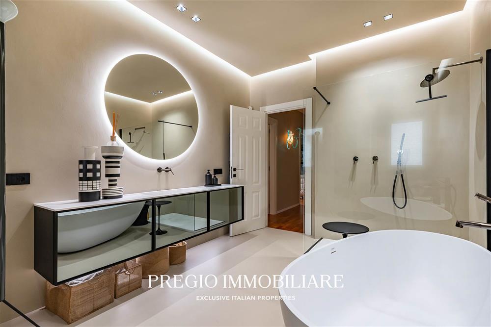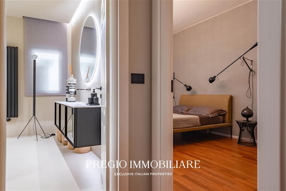 L’abitazione si apre su un raffinato salone doppio, cucina abitabile, due camere da letto, cabina armadio e doppi servizi, di cui una sala da bagno realizzata con finiture in resina e arredi firmati Antonio Lupi. La doppia esposizione garantisce ambienti luminosi e ben ventilati, valorizzati da una distribuzione funzionale e da materiali di alto livello.