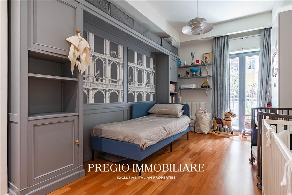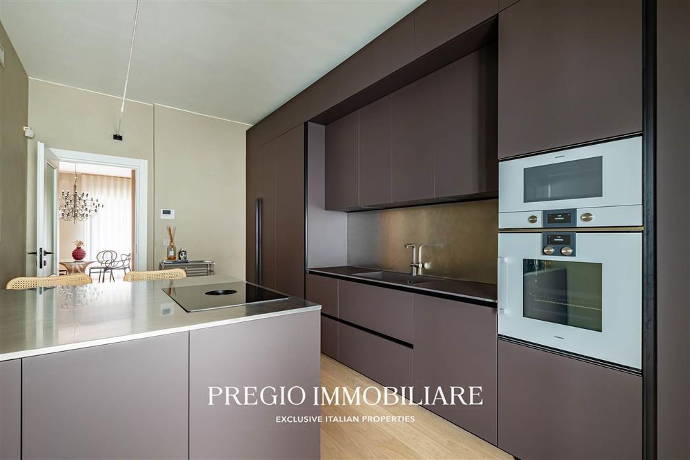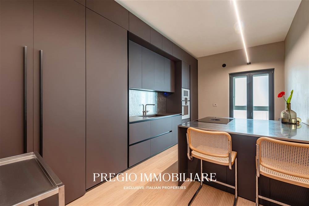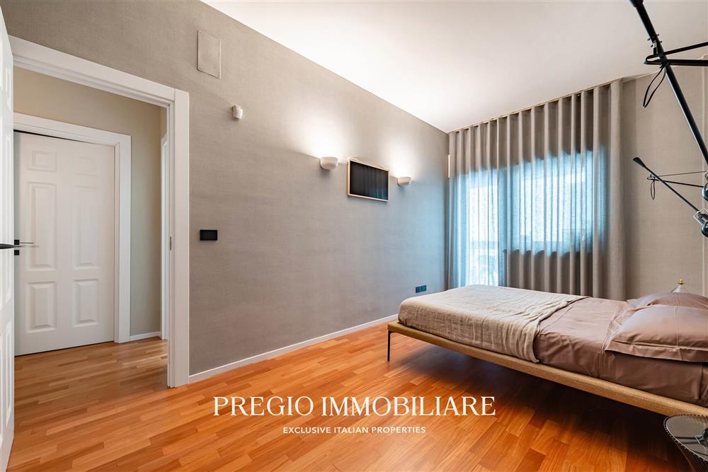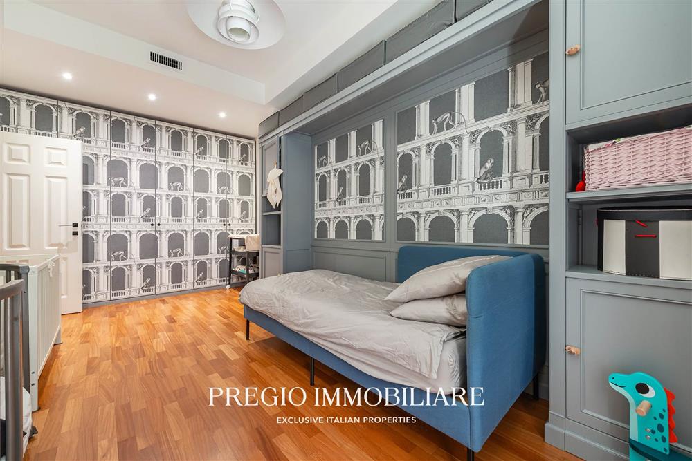 L’abitazione si apre su un raffinato salone doppio, cucina abitabile, due camere da letto, cabina armadio e doppi servizi, di cui una sala da bagno realizzata con finiture in resina e arredi firmati Antonio Lupi. La doppia esposizione garantisce ambienti luminosi e ben ventilati, valorizzati da una distribuzione funzionale e da materiali di alto livello.