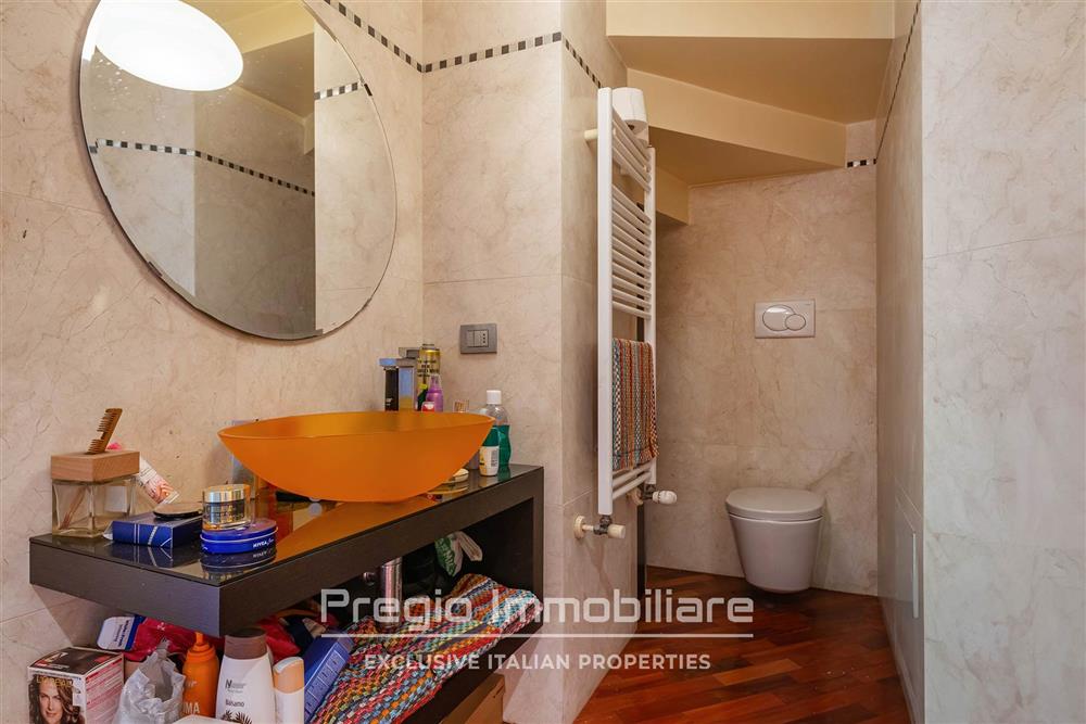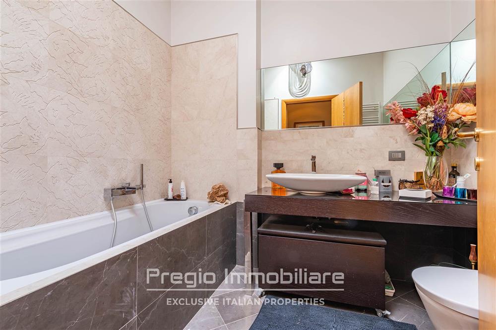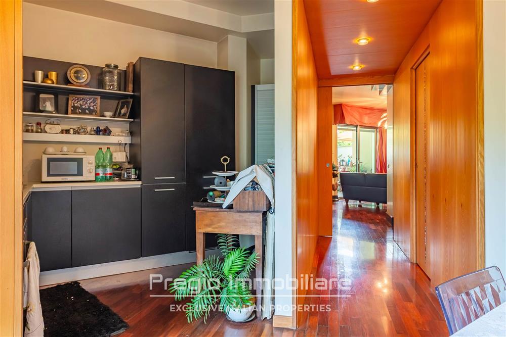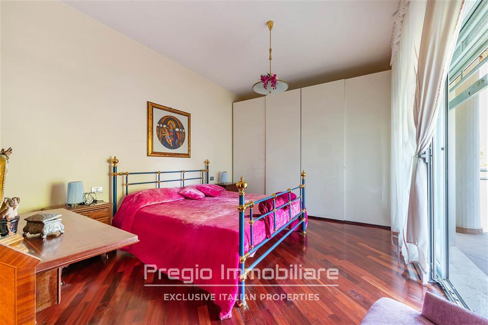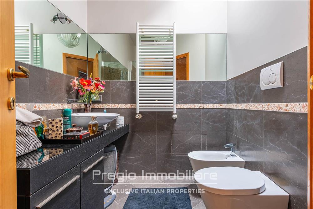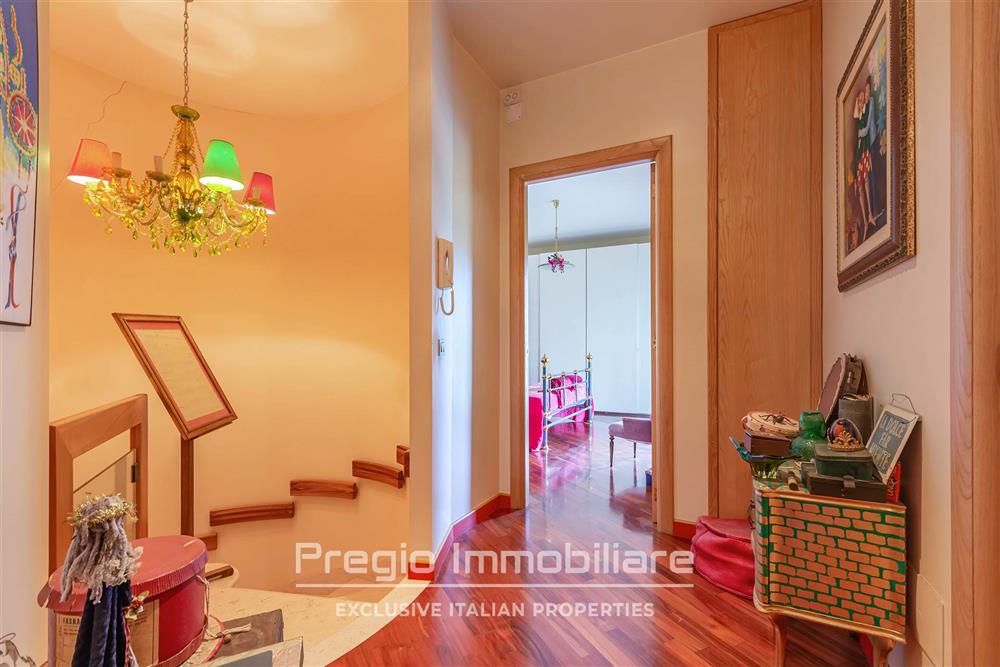 La zona notte al piano superiore comprende tre camere da letto con balconi privati e affaccio sul verde. La suite padronale dispone di bagno en suite con finiture di alto livello. Sono presenti altri due bagni, progettati con la stessa attenzione ai materiali. Il parquet in noce sottolinea la qualità degli interni.