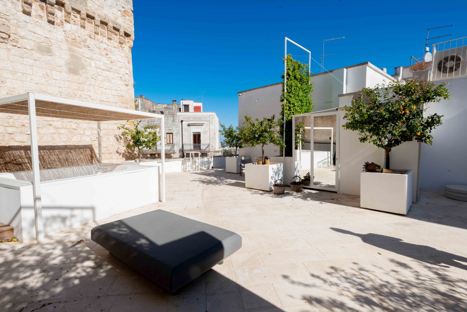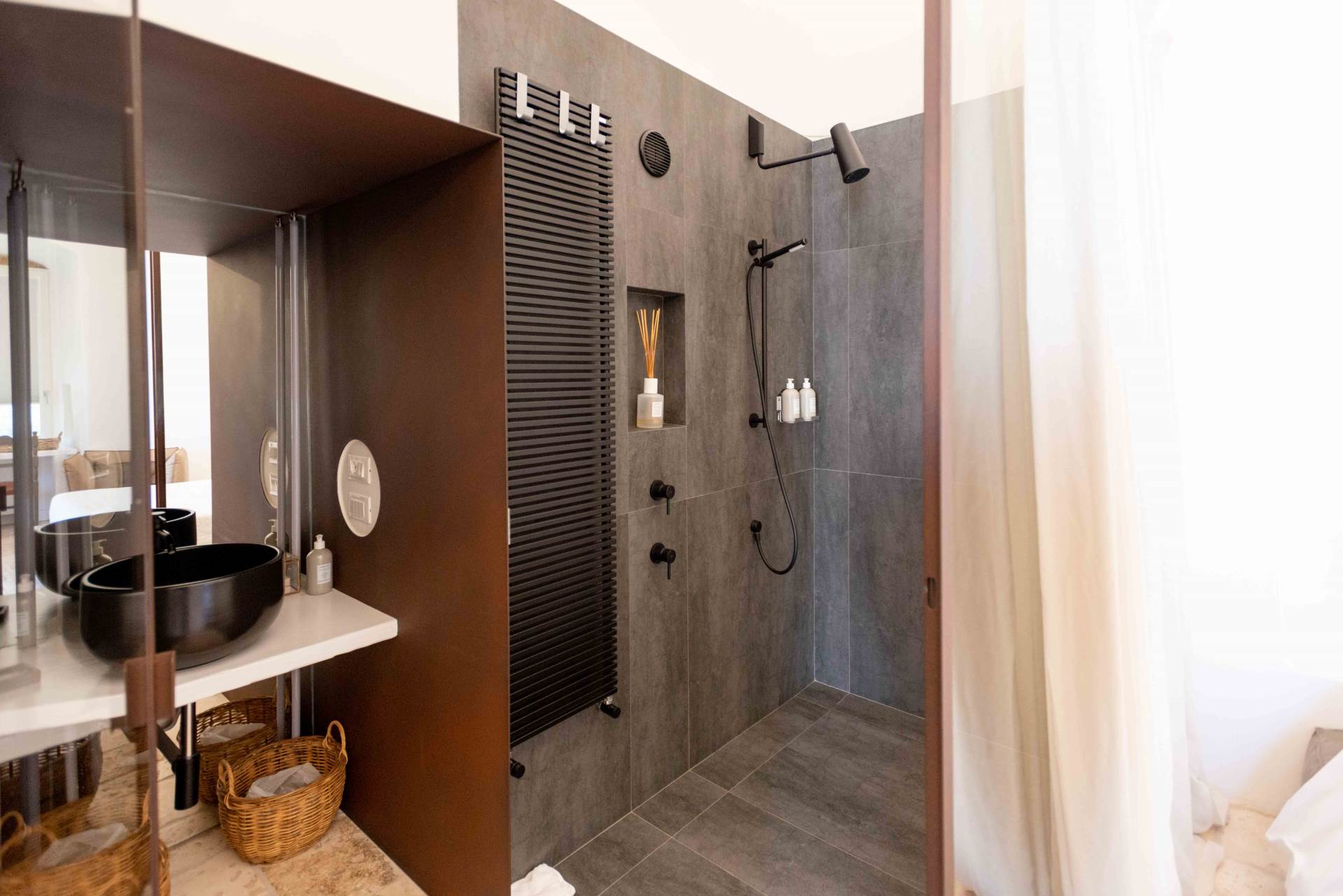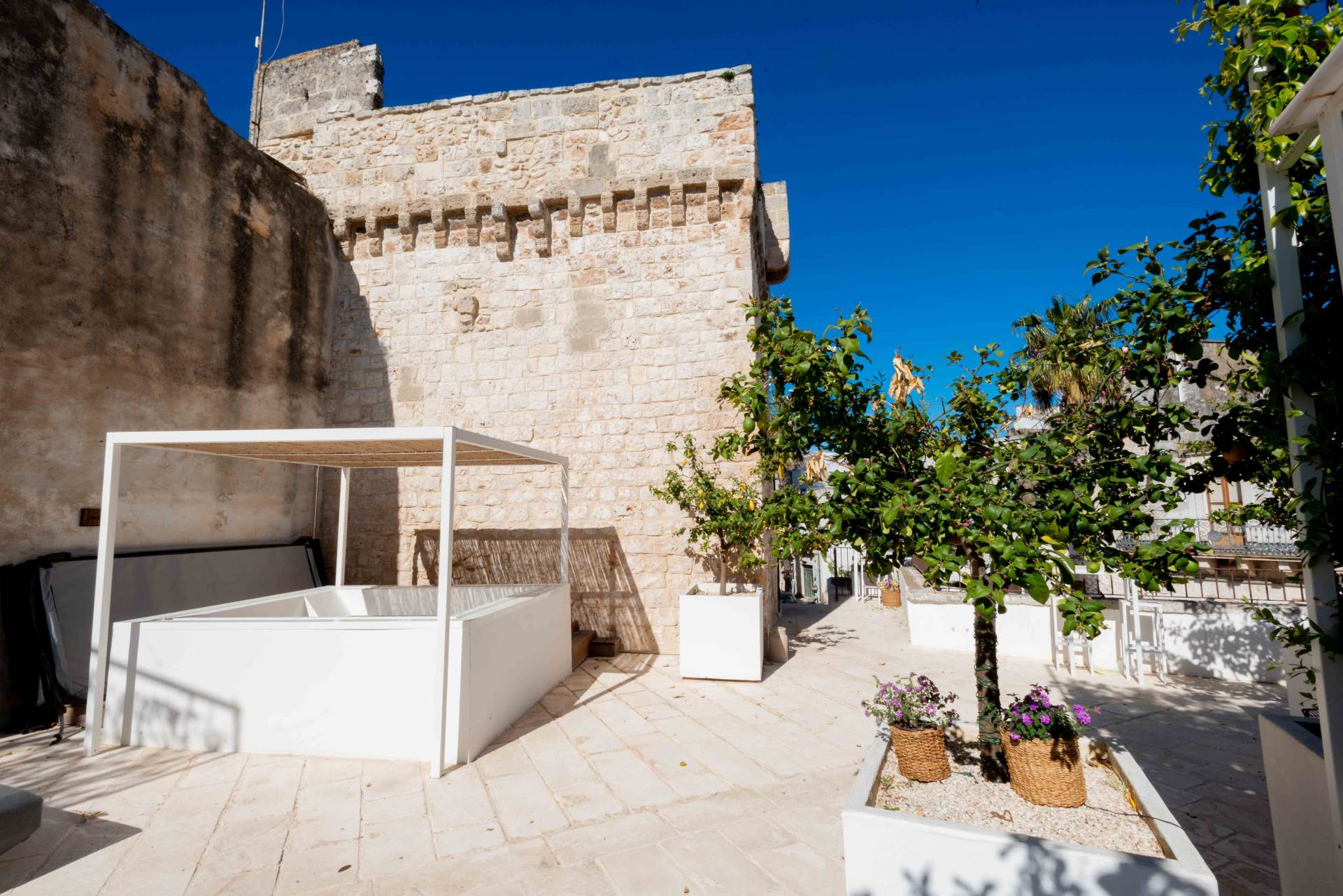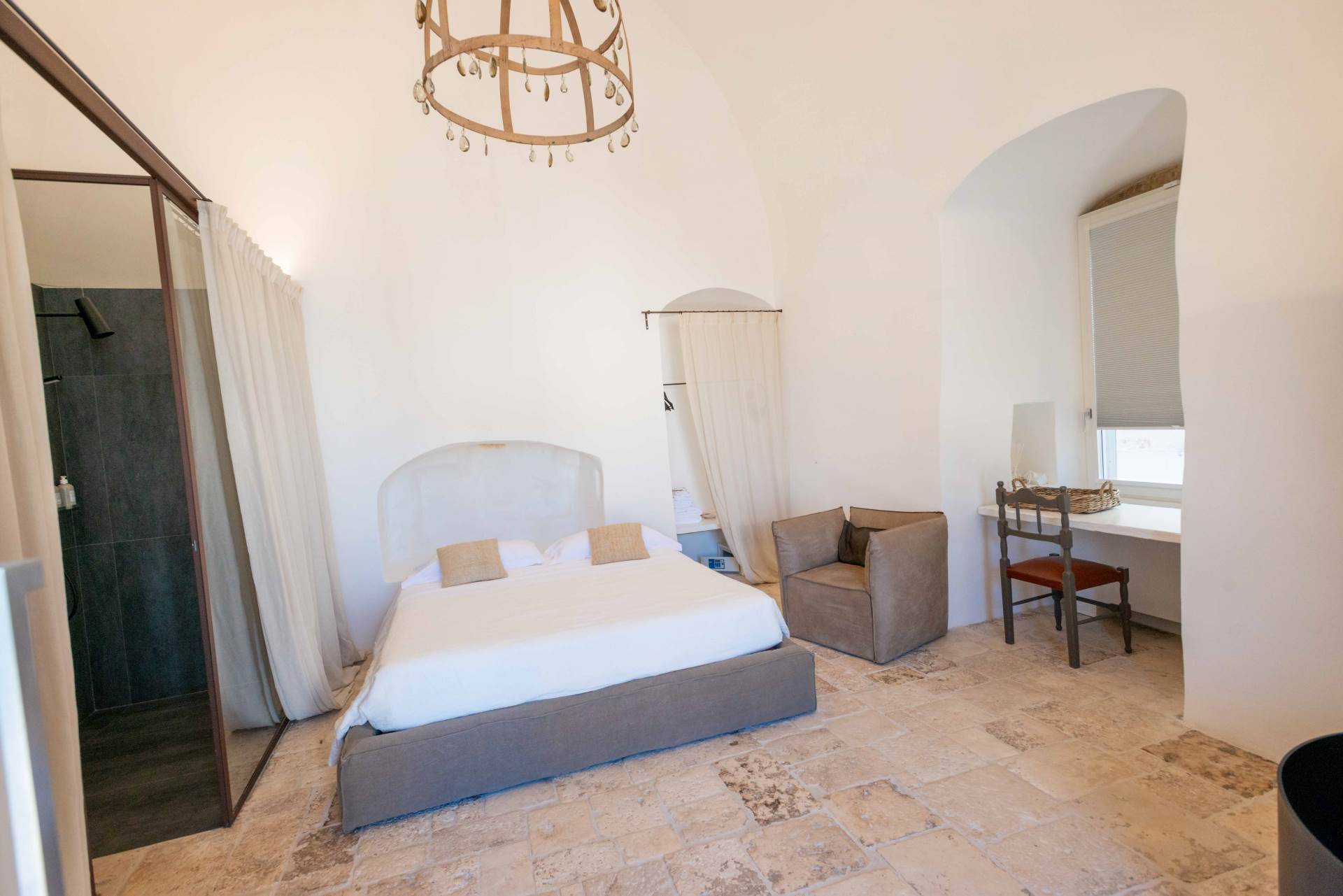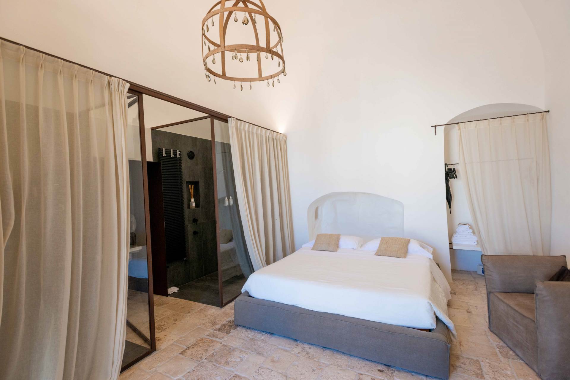 L’accesso alla dimora avviene attraverso un’entrata che conduce ad una suite matrimoniale situata nella torre storica. Questa suite è dotata di una vasca da bagno, una doccia con cromoterapia e offre accesso diretto a un terrazzo panoramico, dove una mini piscina idromassaggio permette di godere di momenti di puro relax. Questo ambiente lussuoso è pensato per chi cerca un’esperienza esclusiva e raffinata.