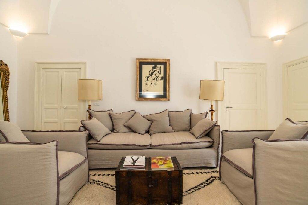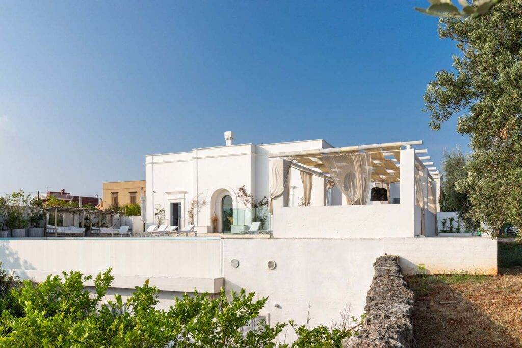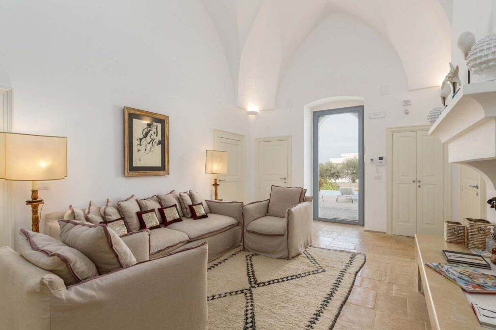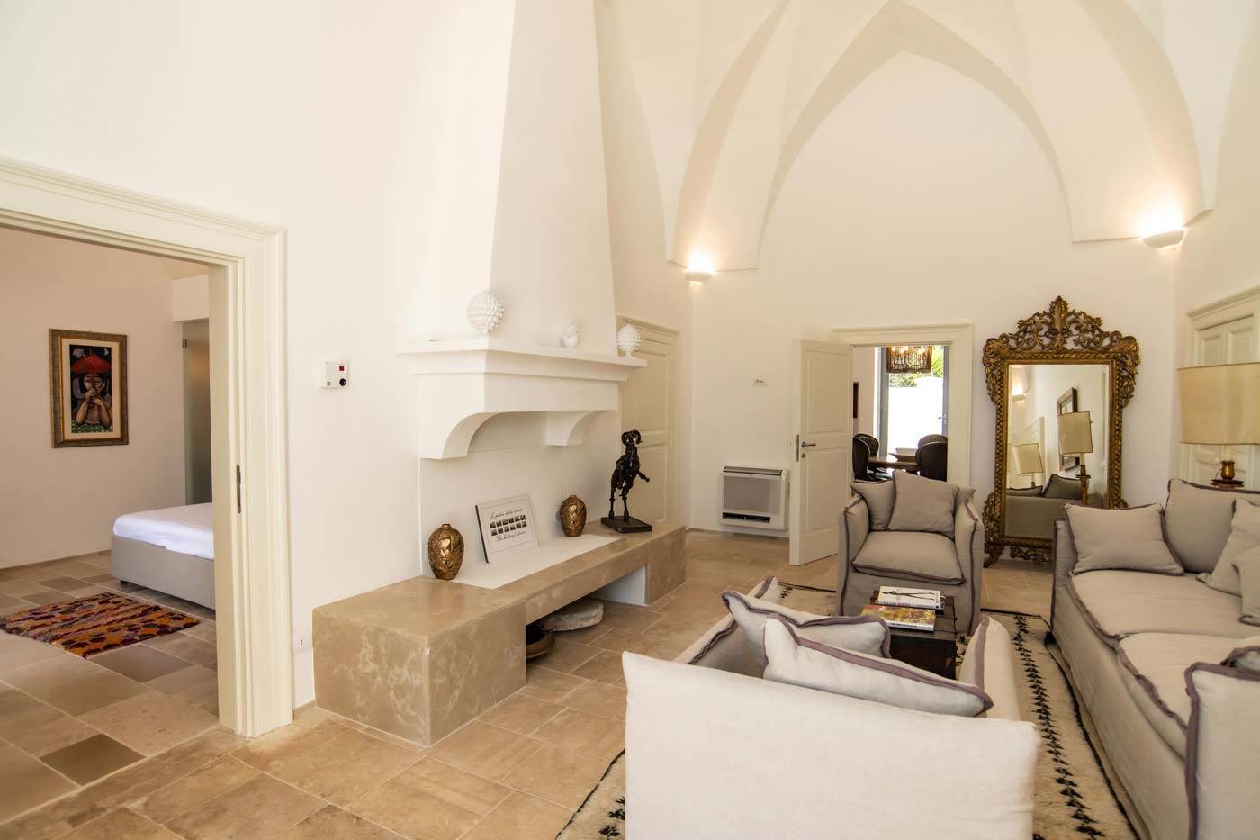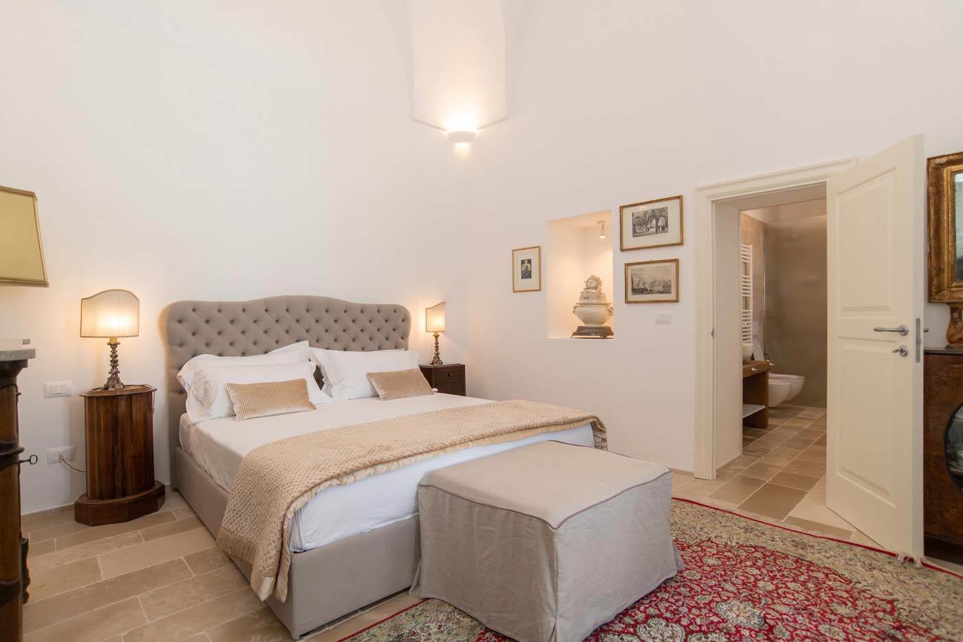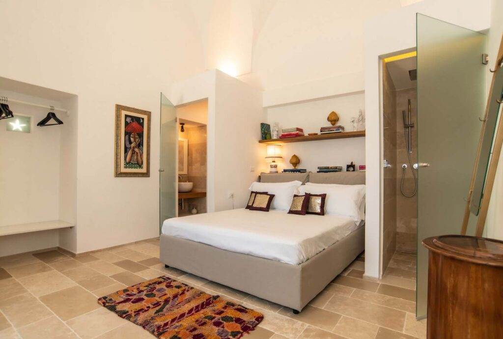 Questa masseria è un autentico esempio di architettura pugliese, con le sue maestose volte a stella e a croce alte 5 metri, caratteristiche delle antiche ville aristocratiche. La struttura si sviluppa su spazi ampi e luminosi: cinque camere da letto, ciascuna con bagno privato e accesso indipendente; sette bagni totali, di cui alcuni dotati di cromoterapia; un elegante salone con camino, arricchito da preziosi volumi d’arte; una sala da pranzo.