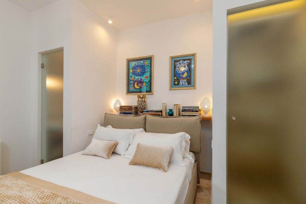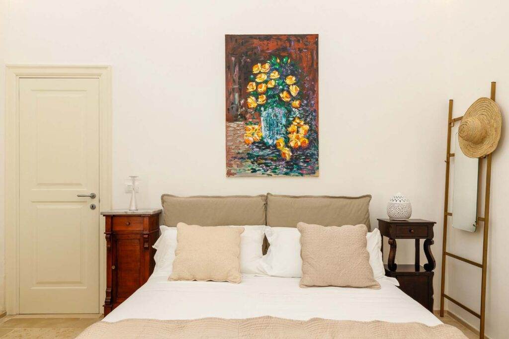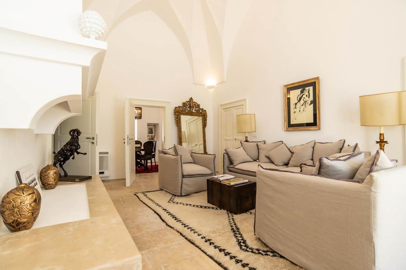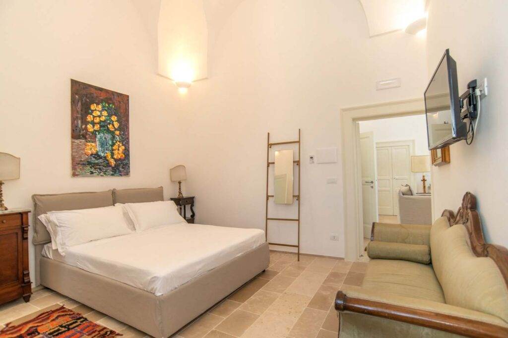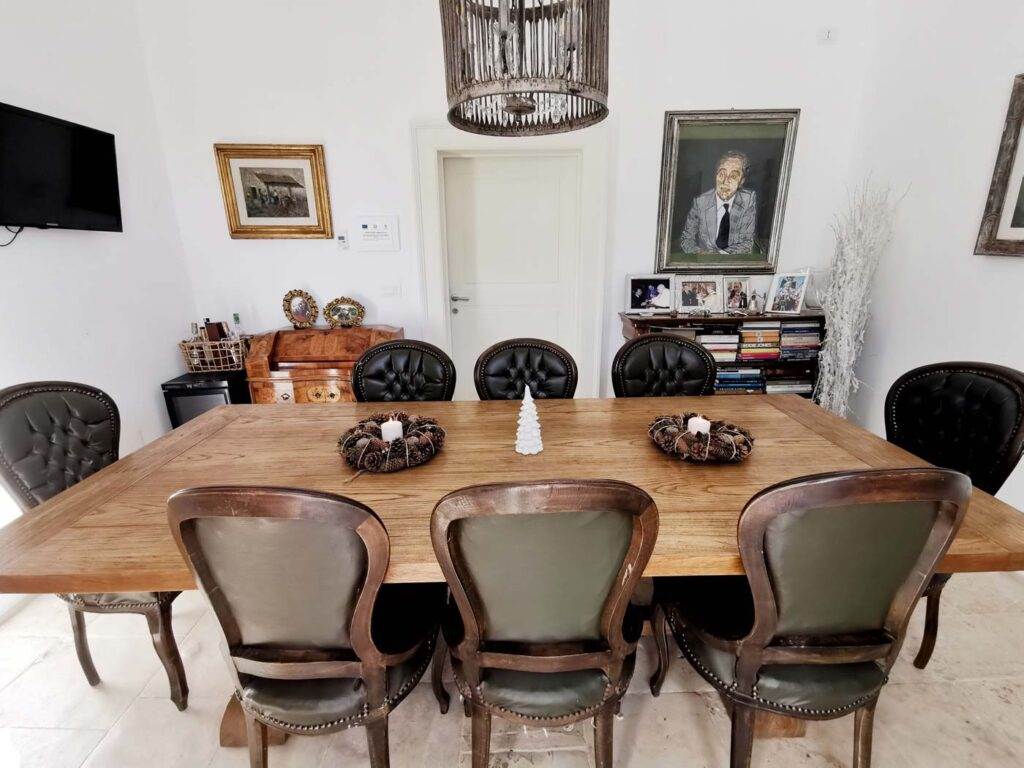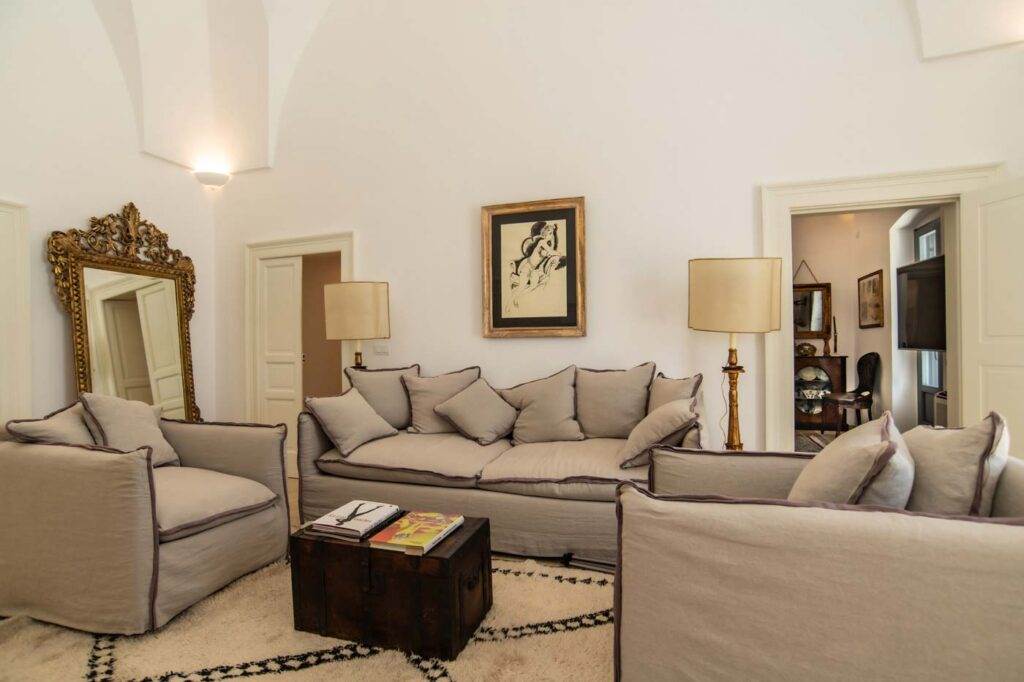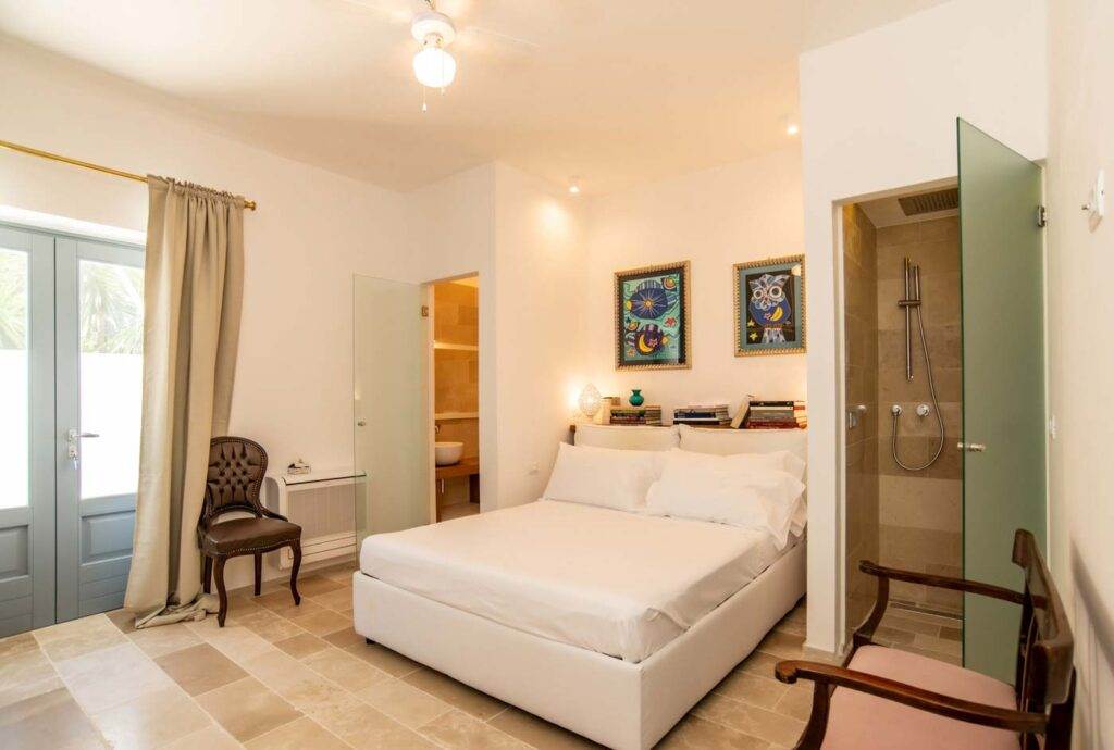 Questa masseria è un autentico esempio di architettura pugliese, con le sue maestose volte a stella e a croce alte 5 metri, caratteristiche delle antiche ville aristocratiche. La struttura si sviluppa su spazi ampi e luminosi: cinque camere da letto, ciascuna con bagno privato e accesso indipendente; sette bagni totali, di cui alcuni dotati di cromoterapia; un elegante salone con camino, arricchito da preziosi volumi d’arte; una sala da pranzo.