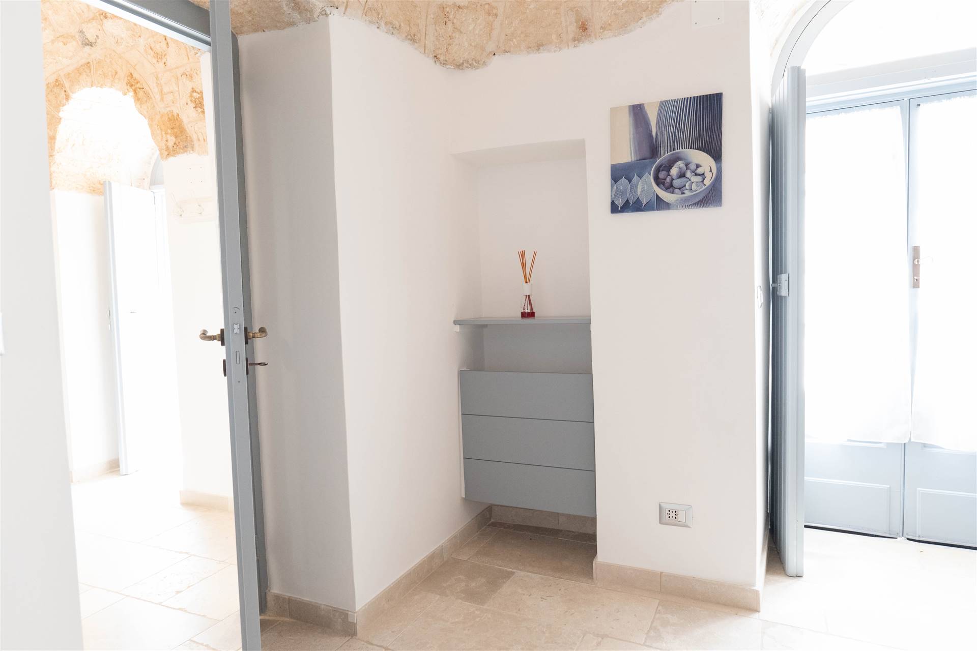 L’immobile si suddivide in tre appartamenti, contando in totale sette trulli a cono e offrendo una superficie complessiva di 140 mq. Ogni appartamento presenta una camera matrimoniale, angolo cottura, sala da pranzo e bagno con doccia, nonché di uno spazio esterno dedicato. Gli interni incantano per le raffinate scelte di design, la cura dei particolari, i pavimenti in chianche, le suggestive volte a botte e i muri in pietra viva.