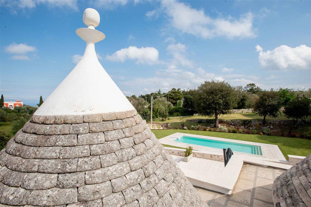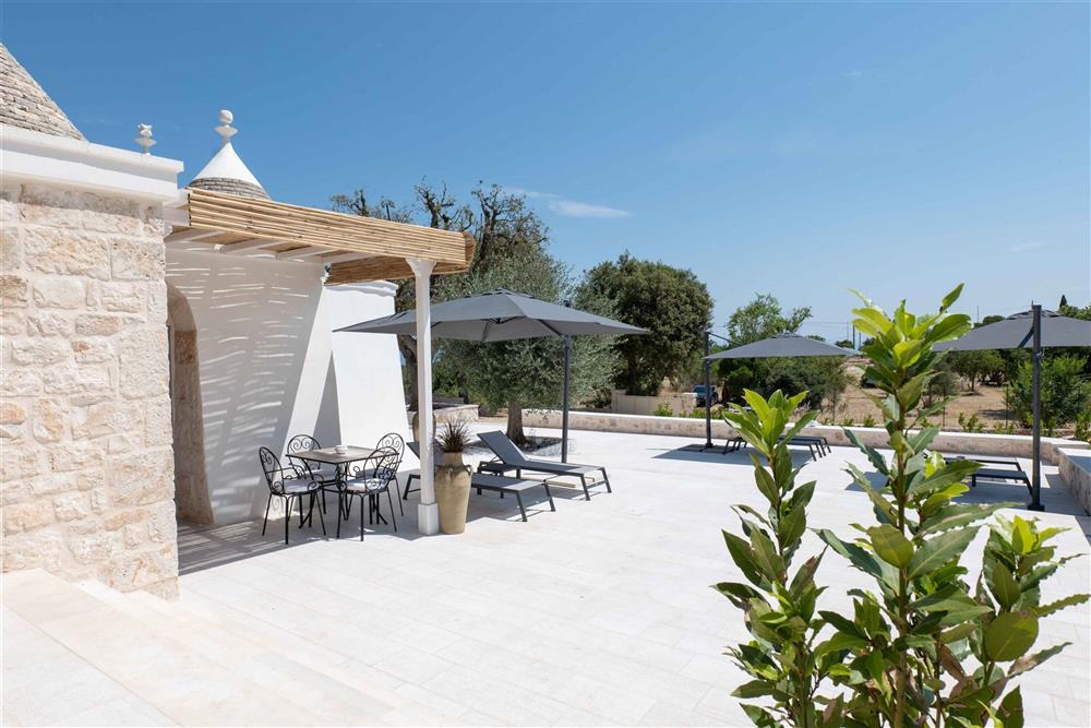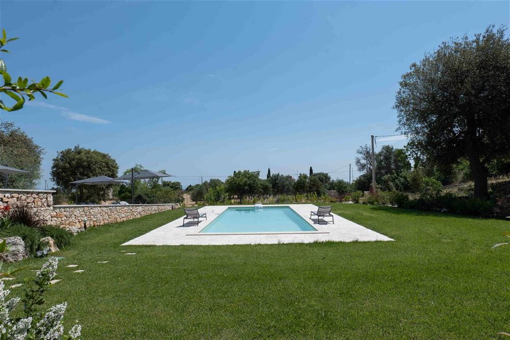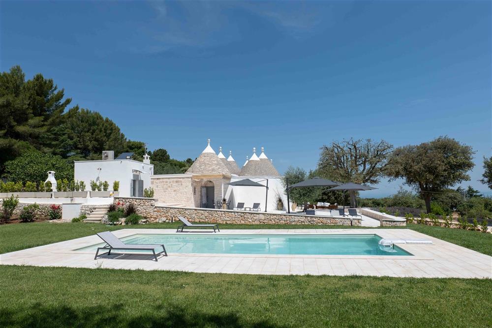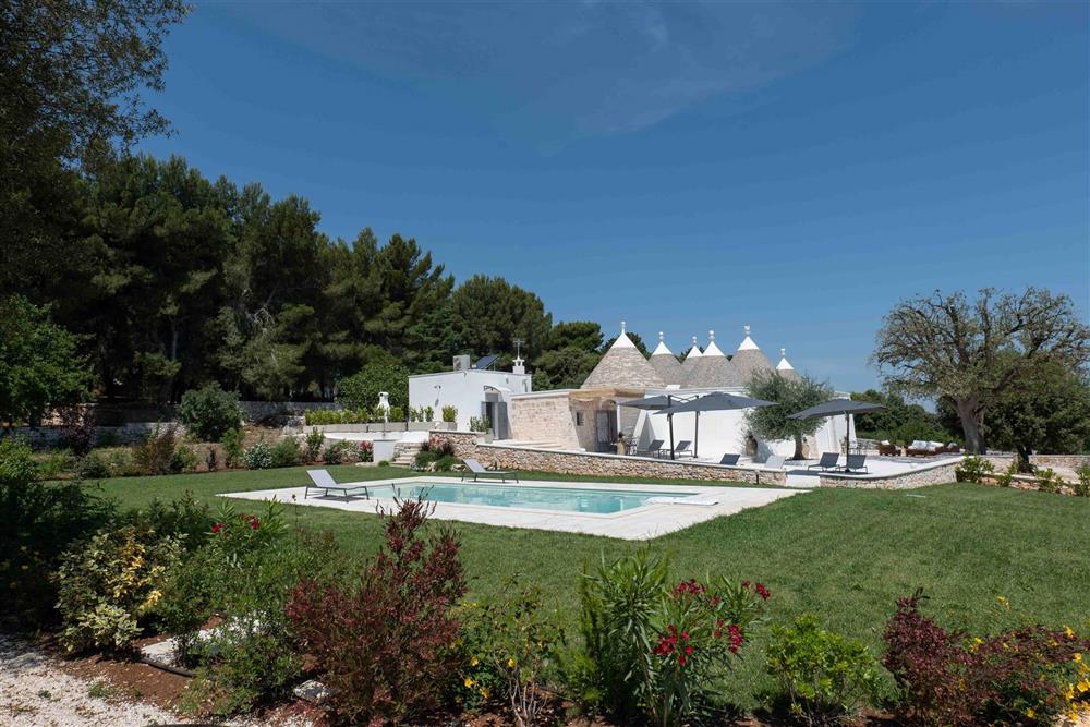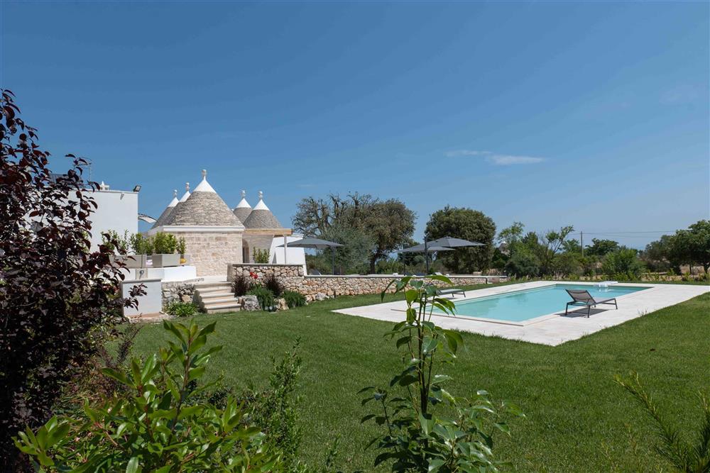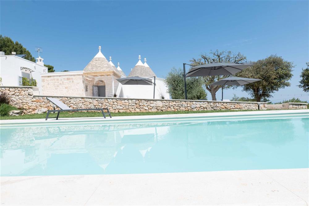 All’esterno, il terreno circostante si estende in tutta la sua accattivante bellezza, ricco di ulivi secolari e contornato da muretti a secco restaurati con maestria secondo la tradizione dei mastri trullari. Fiore all’occhiello è la piscina, immersa nel verde in tutta la sua eleganza e attrezzata di una zona ristoro in patio, dove poter godere di piacevoli momenti all’aperto.