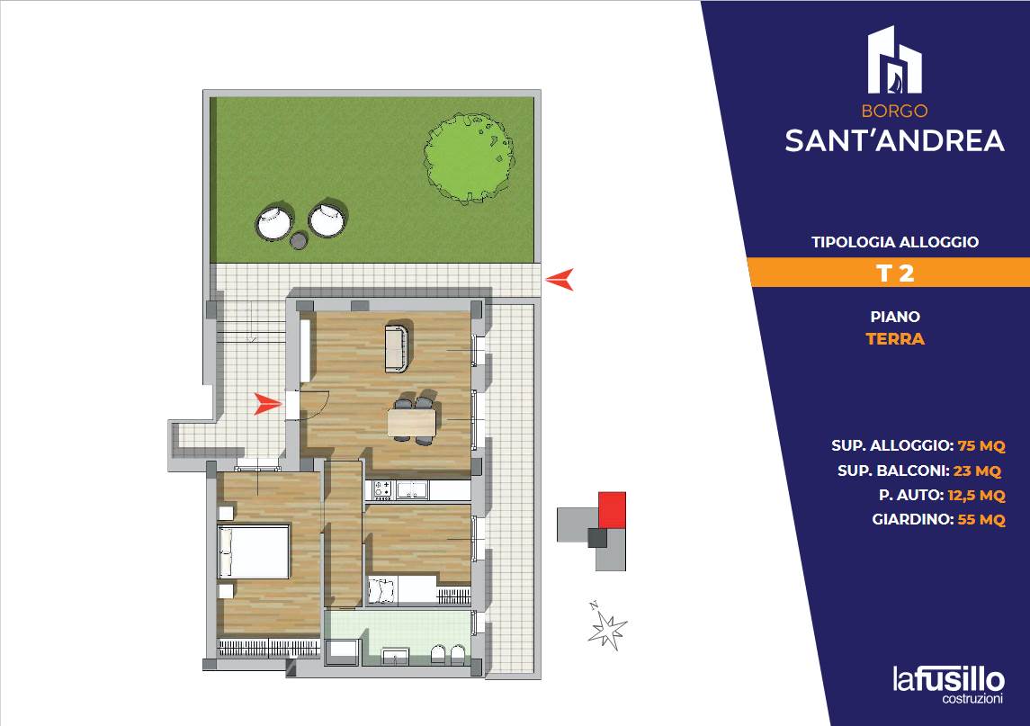 L’interno progettato con cura, comprende zona living open-space, due camere da letto e un bagno, con ambienti ben distribuiti e curati nei dettagli per garantire funzionalità e benessere. La proposta si distingue per una spaziosa veranda e un giardino privato, perfetti per pranzi o cene all’aperto; è incluso un posto auto (di proprietà) che assicura comodità e autonomia.
