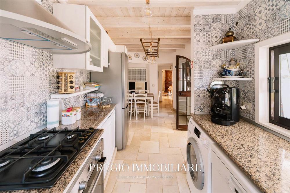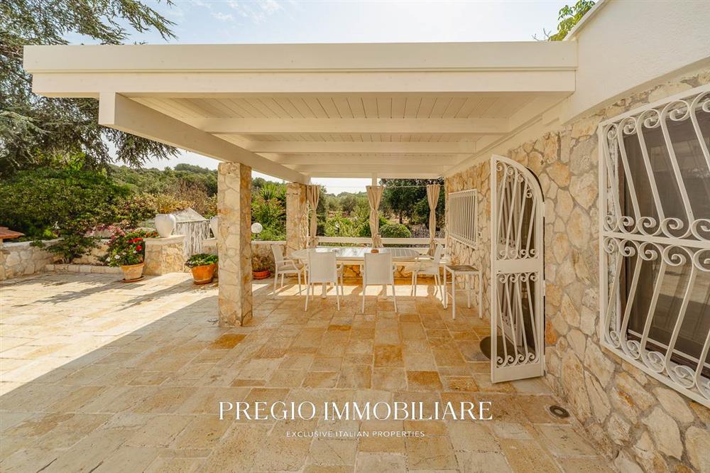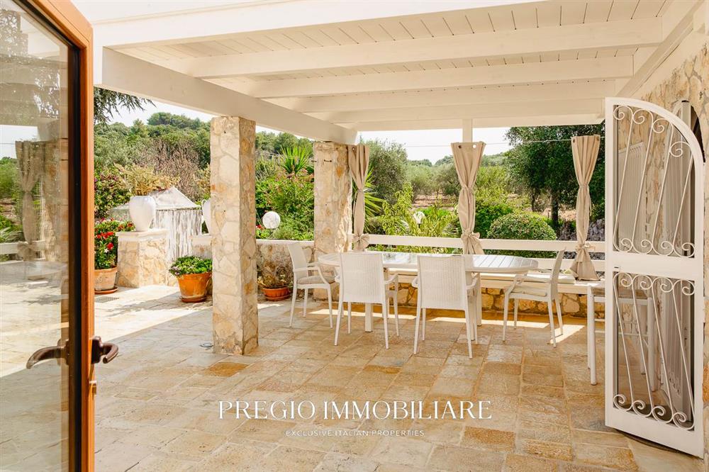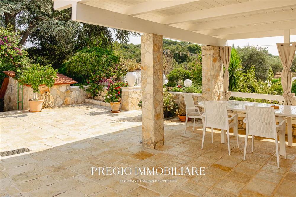 All’esterno, un vero paradiso privato: portico ombreggiato, forno tradizionale, sedute in pietra, aiuole e alberi mediterranei che creano un’atmosfera di quiete e intimità.