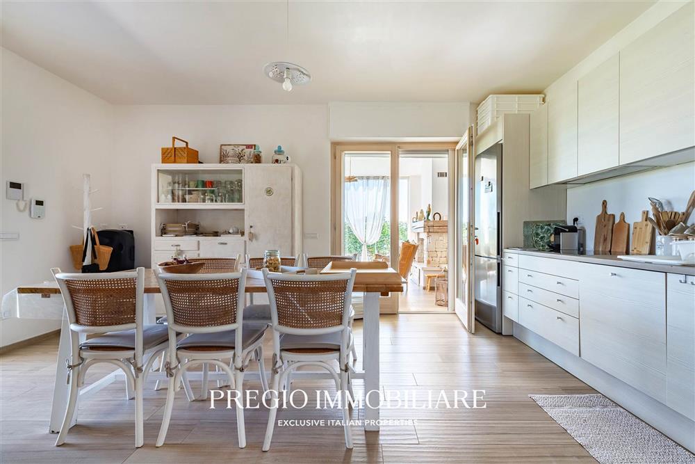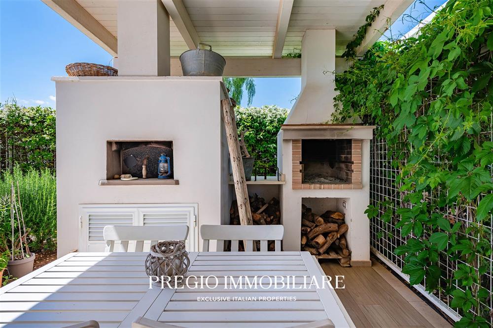 Il vero cuore della zona living è la suggestiva veranda, pensata per essere vissuta in ogni stagione: dotata di un caminetto e di un angolo TV, è chiudibile con un moderno sistema di vetrate scorrevoli, che la trasforma in un’estensione naturale del soggiorno, ideale per pranzi, cene o momenti di relax al coperto senza rinunciare alla vista sul giardino.