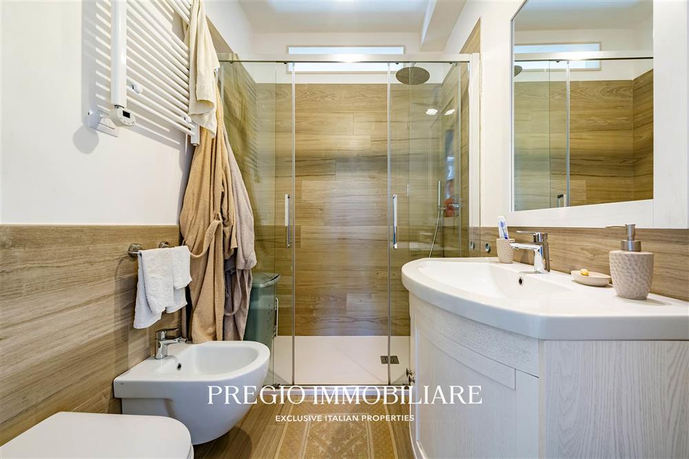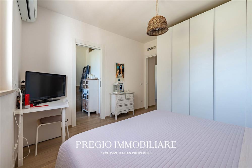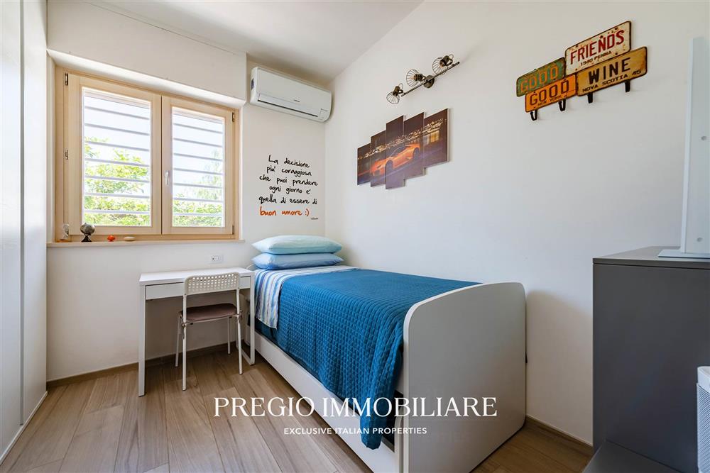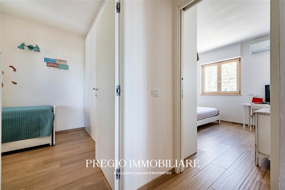 L’abitazione è composta da tre camere da letto, ben proporzionate, di cui una dotata di bagno privato. Le altre due camere condividono un secondo bagno, anch’esso rifinito con materiali di qualità. La cucina, ampia e abitabile, è perfetta per chi ama cucinare e vivere lo spazio conviviale con la famiglia o con gli ospiti.