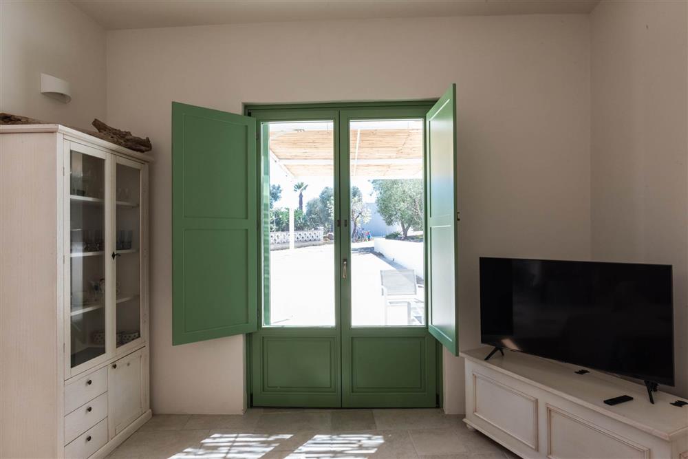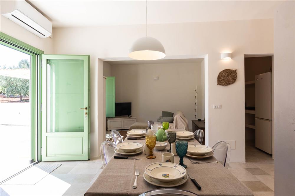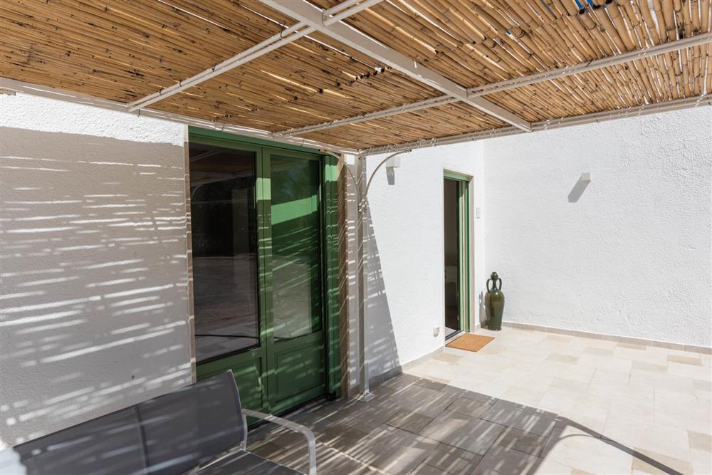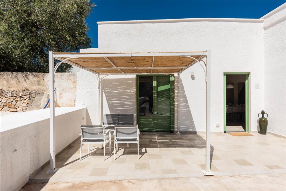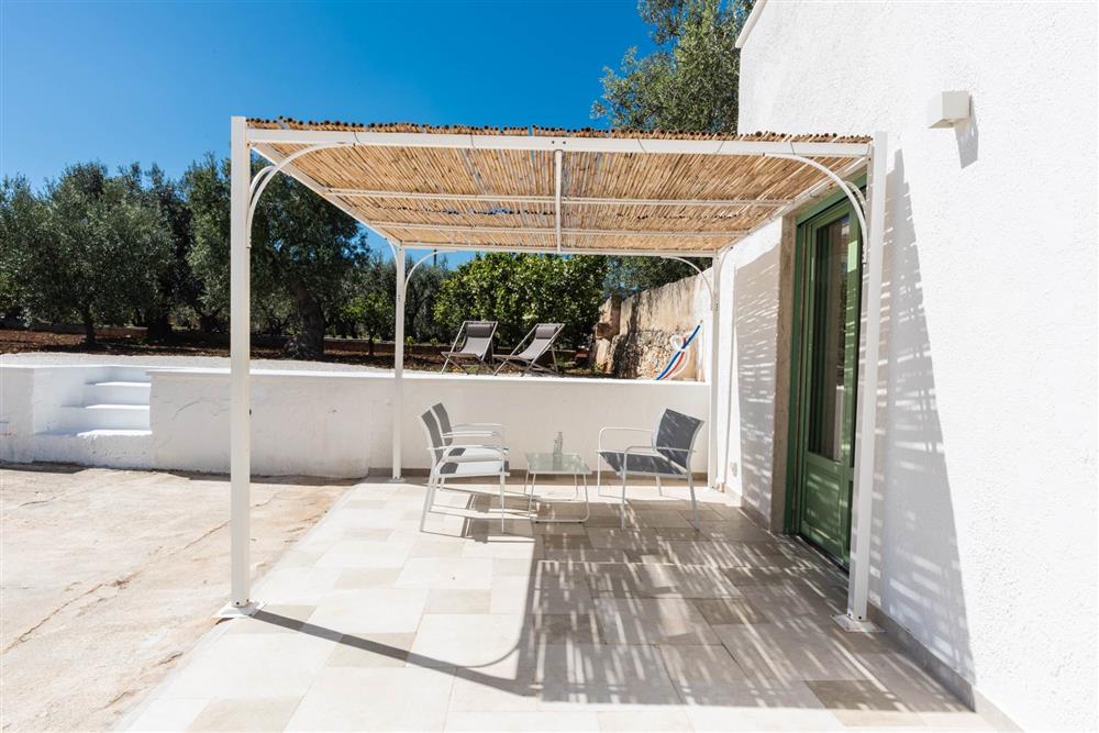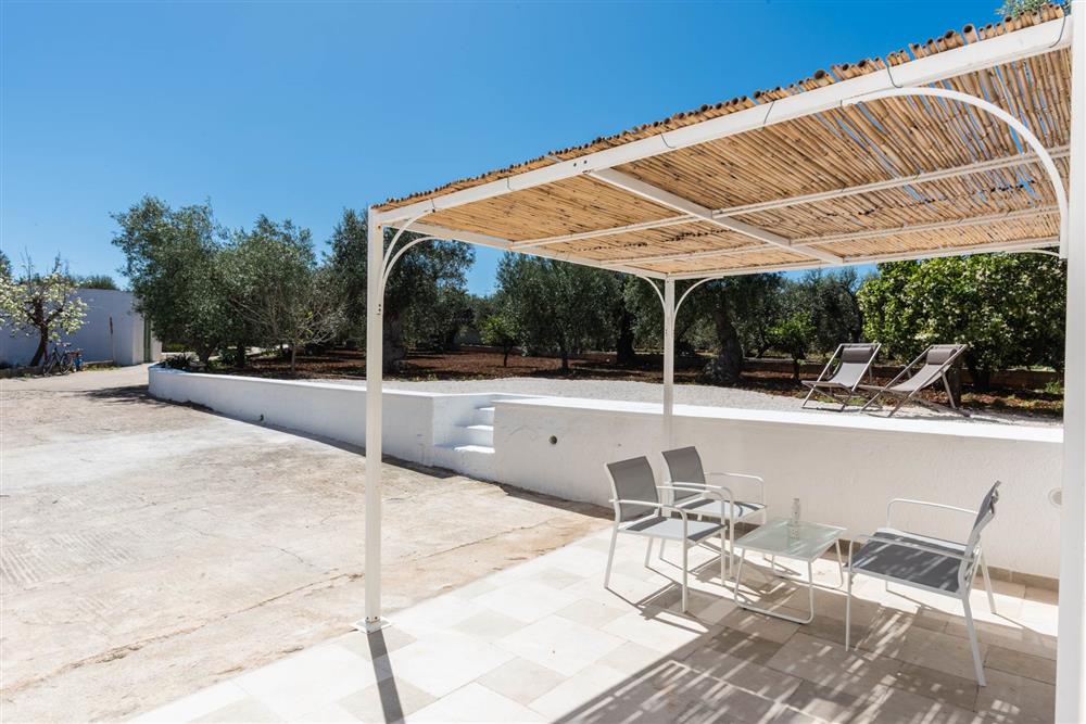 All’esterno, un ampio portico pavimentato collegato alla zona giorno crea una naturale estensione degli ambienti interni, ideale per vivere gli spazi all’aperto. Il terreno circostante ospita alberi da frutto e olivi secolari, offrendo un contesto tipico della campagna pugliese.