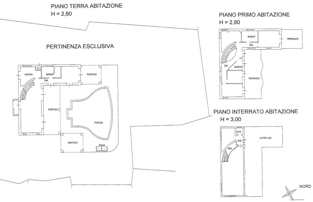 Al pian terreno, troviamo un luminoso soggiorno, una sala da pranzo, una cucina abitabile, una stanza studio, un bagno e una rampa di scale che conduce ai piani superiore e inferiore. Al piano primo, si trovano tre camere da letto, due bagni e due comode terrazze, di cui una da 50 mq con accesso da quattro diverse camere e una di 20 mq d’esclusivo accesso della camera da letto angolare. Al piano interrato, troviamo un bagno, una rimessa, un vano tecnico e un garage capace di ospitare fino a quattro autoveicoli.