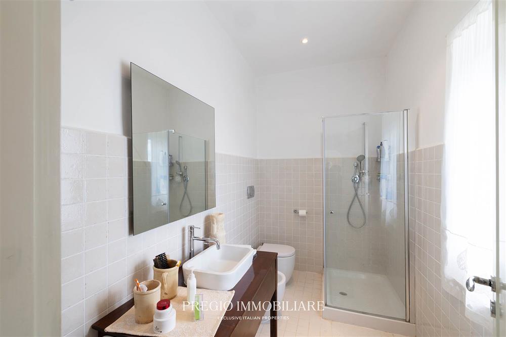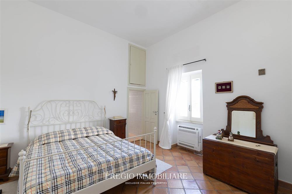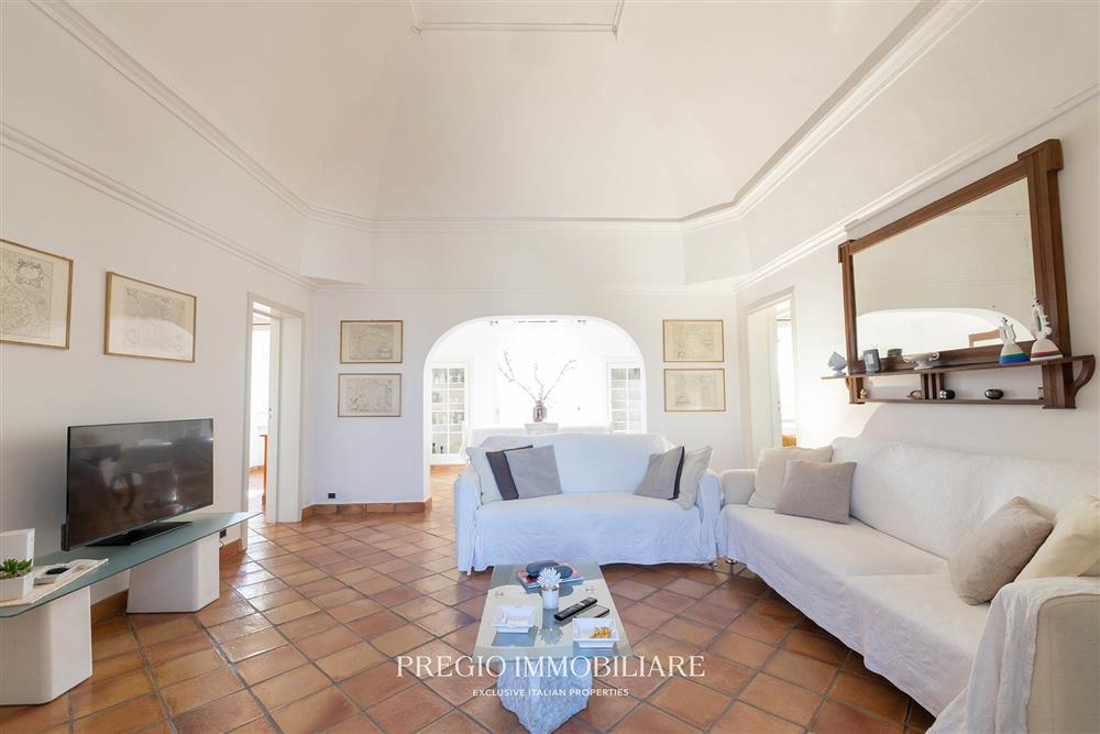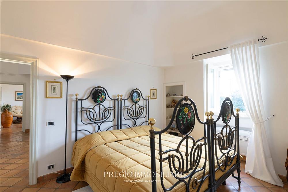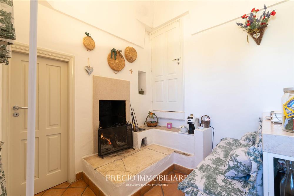 La residenza principale si sviluppa su un unico livello e comprende una zona living con camino e affacci panoramici, cucina separata con ripostiglio e lavanderia, due camere da letto entrambe con balcone, di cui una con bagno en suite, un ulteriore bagno a servizio della zona giorno e uno studio con vista mare, potenzialmente riconfigurabile come terza camera. I pavimenti sono in cotto lavorato a mano e l’immobile è servito da impianto a pompa di calore con fancoil, a beneficio di un utilizzo confortevole in ogni stagione.