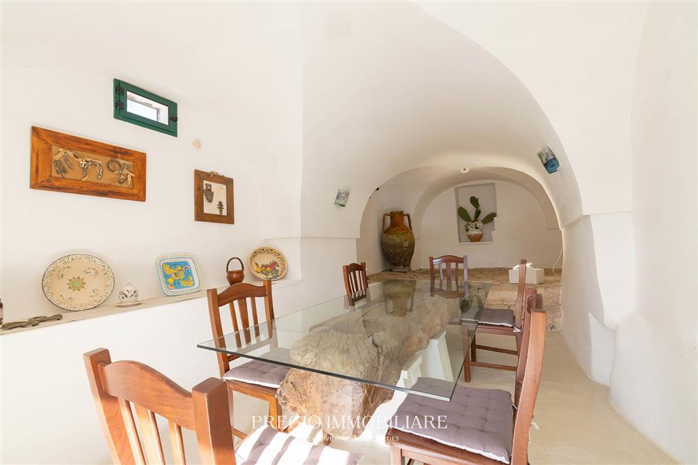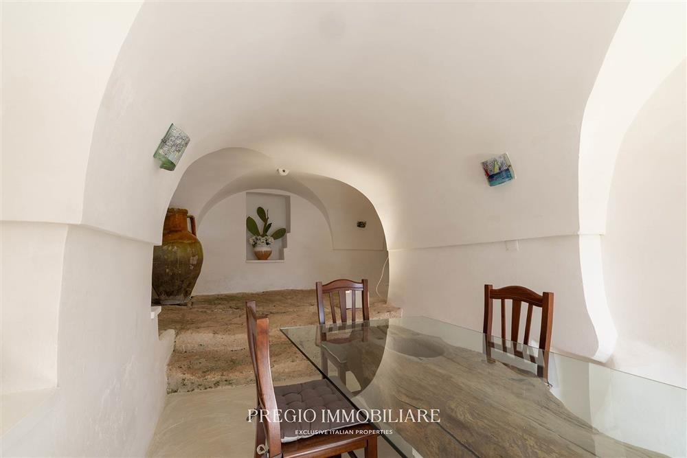 Al piano inferiore si trovano tre depositi, tra cui un ambiente con pavimentazione in roccia, camino e nicchia in pietra con cucina. A questi si affiancano due frantoi ipogei di circa 150 mq ciascuno, riconducibili a epoche differenti, che costituiscono un elemento di particolare interesse storico e volumetrico all’interno della proprietà e offrono spazio per eventuali funzioni dedicate.