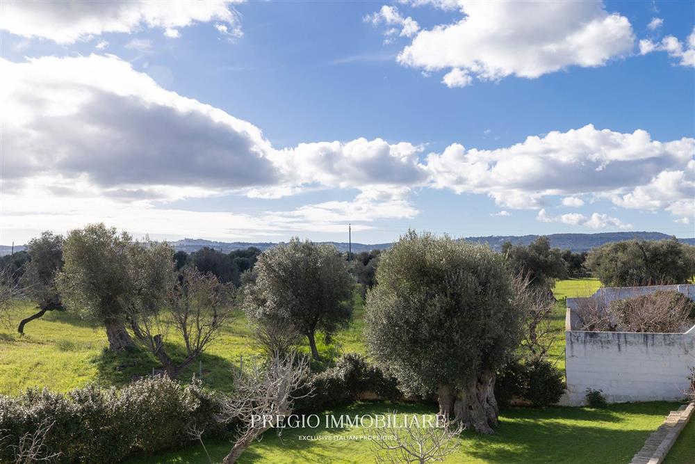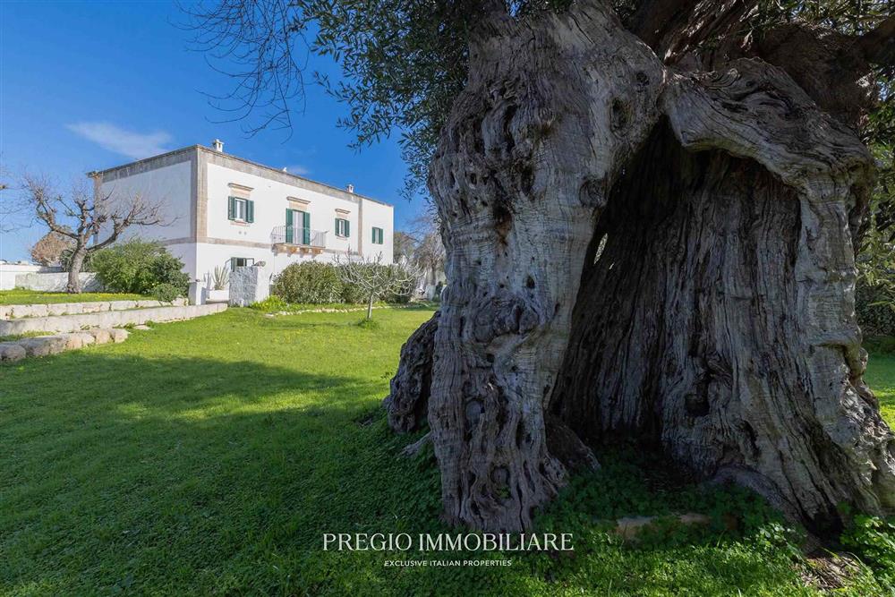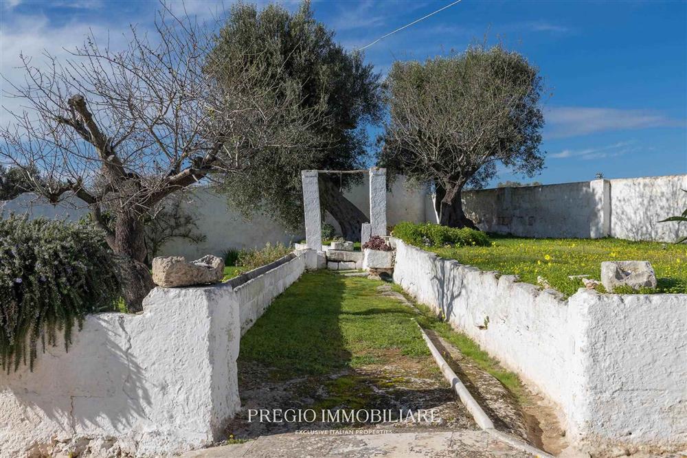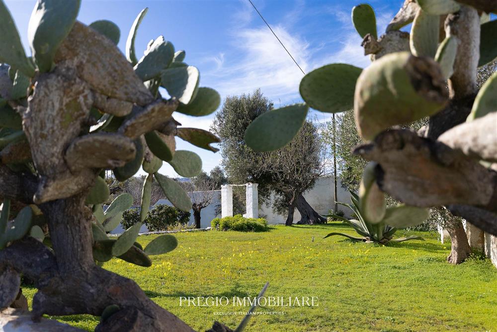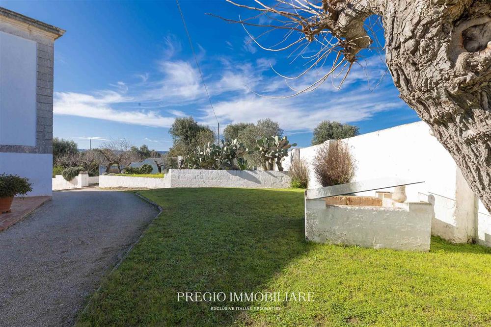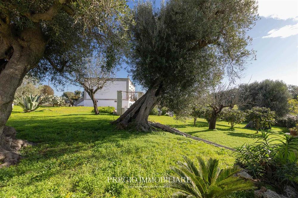 La tenuta si estende per circa 5 ettari tra uliveto e mandorleto in produzione. Un giardino recintato in pietra con ulivi secolari definisce il nucleo della residenza e lo distingue dal terreno agricolo, configurando un ambito dedicato alla parte abitativa e alla vita all’aperto.
