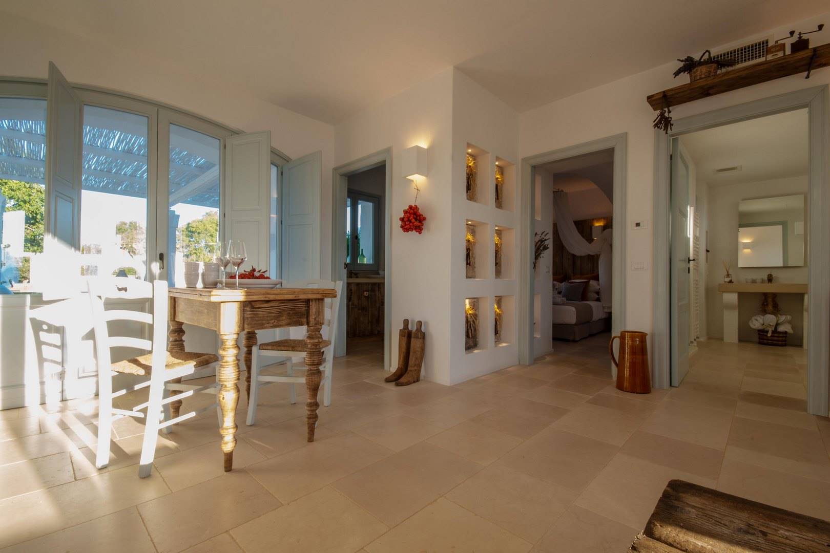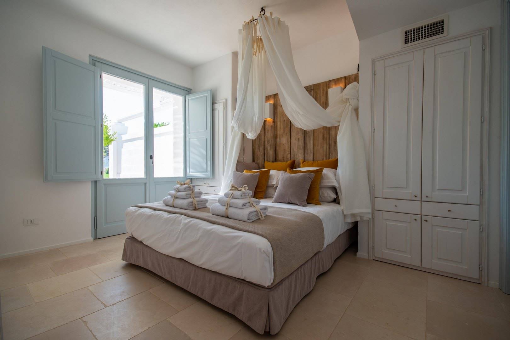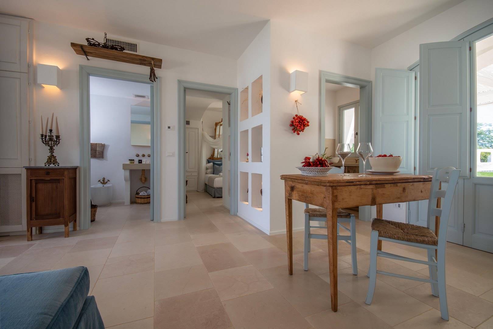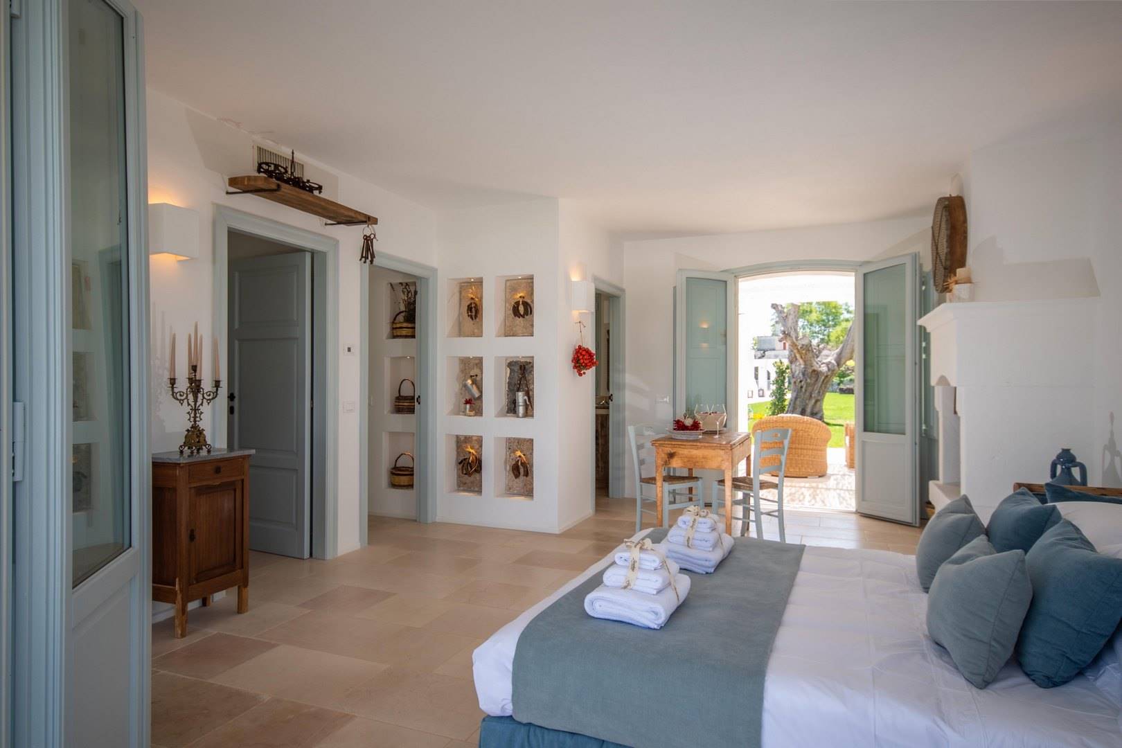 Un’antica masseria nobiliare, articolata in cinque edifici distinti, accoglie oggi ambienti ampi, luminosi e versatili: numerose camere e suite, zone giorno raffinate, cucine private, locali tecnici e spazi trasformabili in nuove unità abitative o dependance. Il layout attuale garantisce privacy assoluta e grande capacità ricettiva, con la possibilità di riconfigurare gli spazi secondo esigenze personali o progettuali.