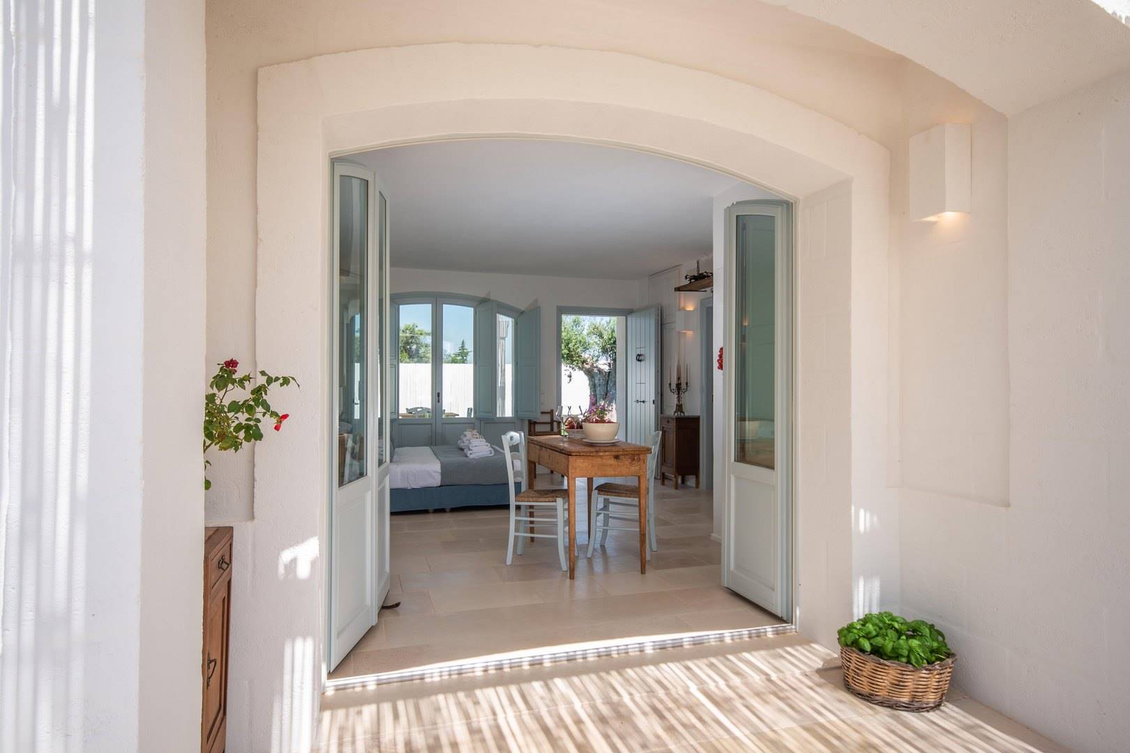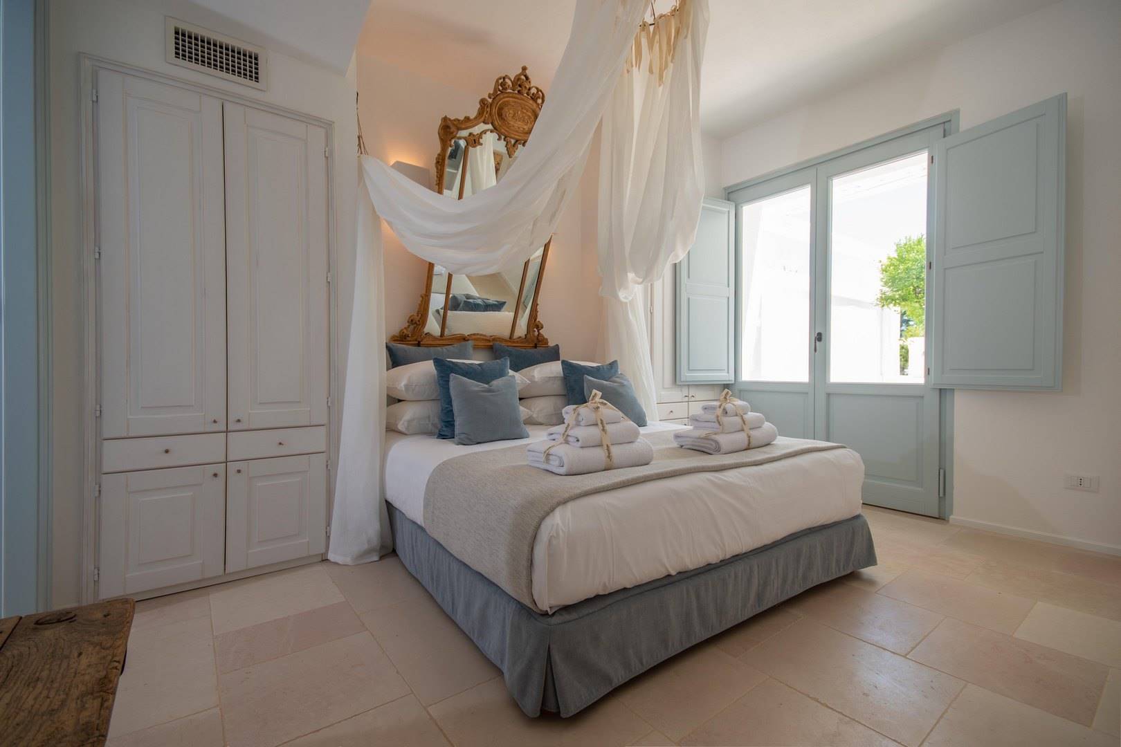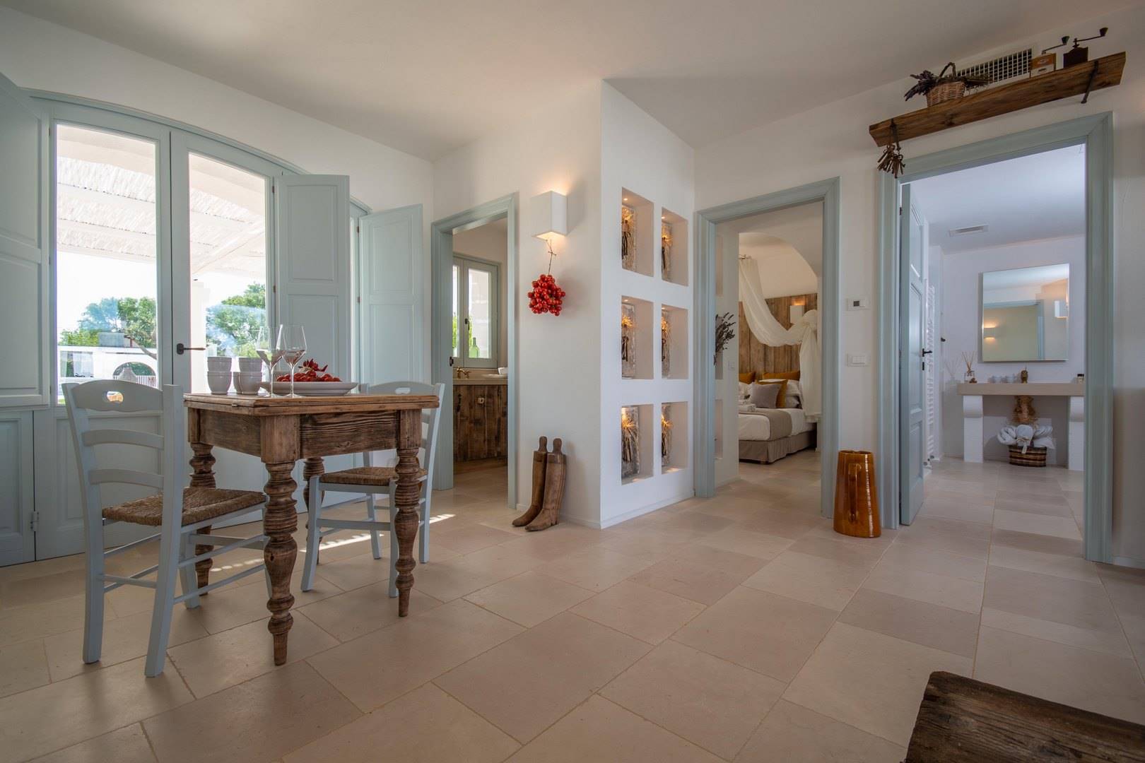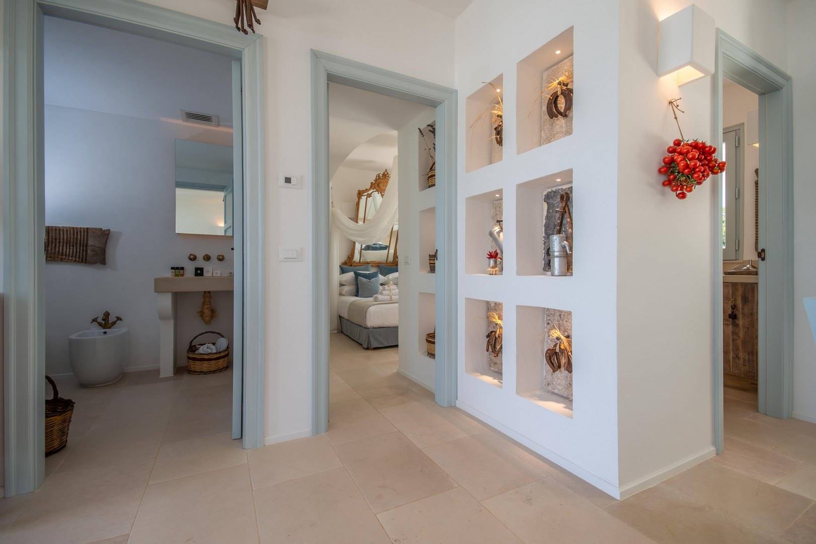 Un’antica masseria nobiliare, articolata in cinque edifici distinti, accoglie oggi ambienti ampi, luminosi e versatili: numerose camere e suite, zone giorno raffinate, cucine private, locali tecnici e spazi trasformabili in nuove unità abitative o dependance. Il layout attuale garantisce privacy assoluta e grande capacità ricettiva, con la possibilità di riconfigurare gli spazi secondo esigenze personali o progettuali.