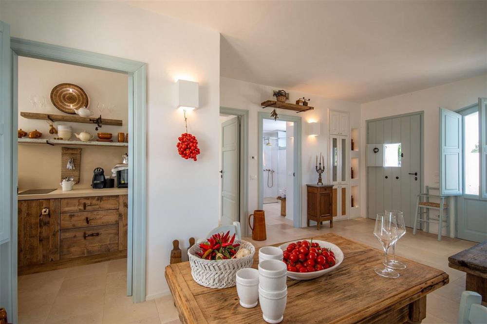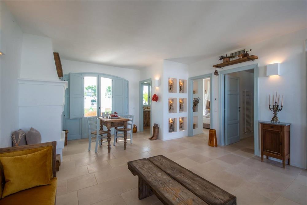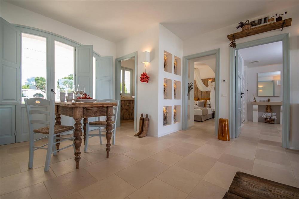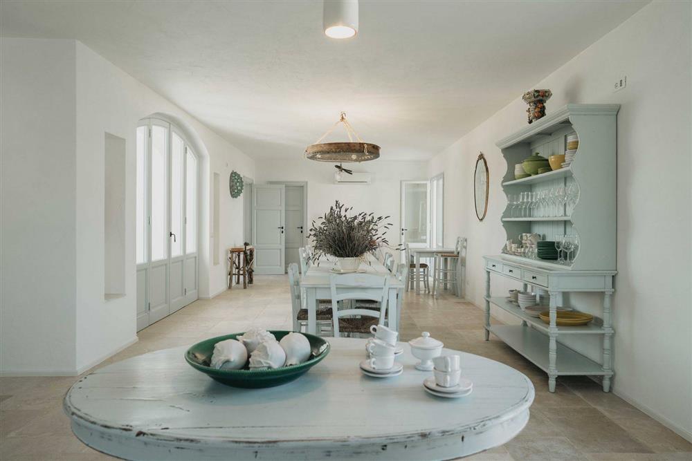 Un’antica masseria nobiliare, articolata in cinque edifici distinti, accoglie oggi ambienti ampi, luminosi e versatili: numerose camere e suite, zone giorno raffinate, cucine private, locali tecnici e spazi trasformabili in nuove unità abitative o dependance. Il layout attuale garantisce privacy assoluta e grande capacità ricettiva, con la possibilità di riconfigurare gli spazi secondo esigenze personali o progettuali.