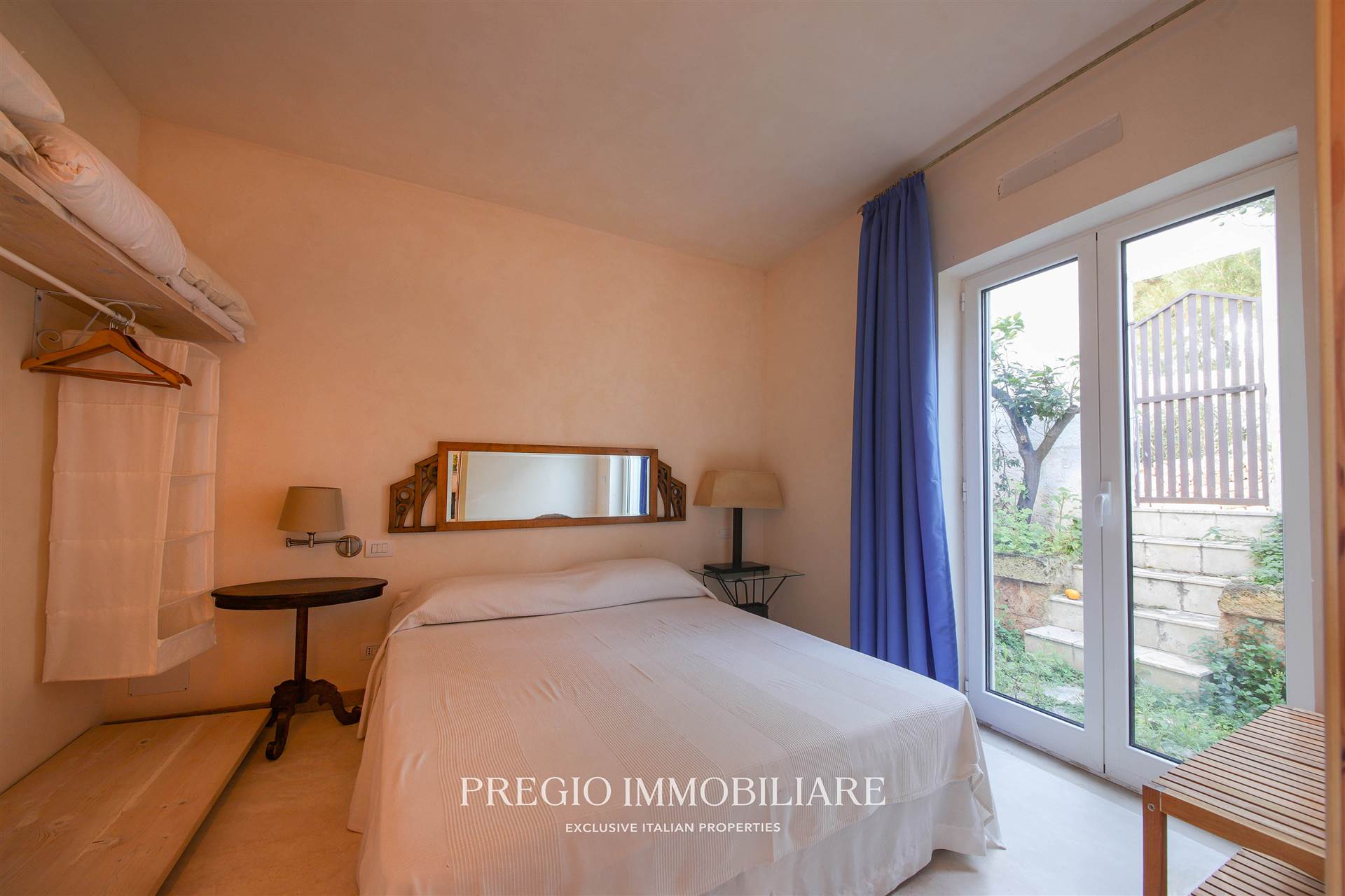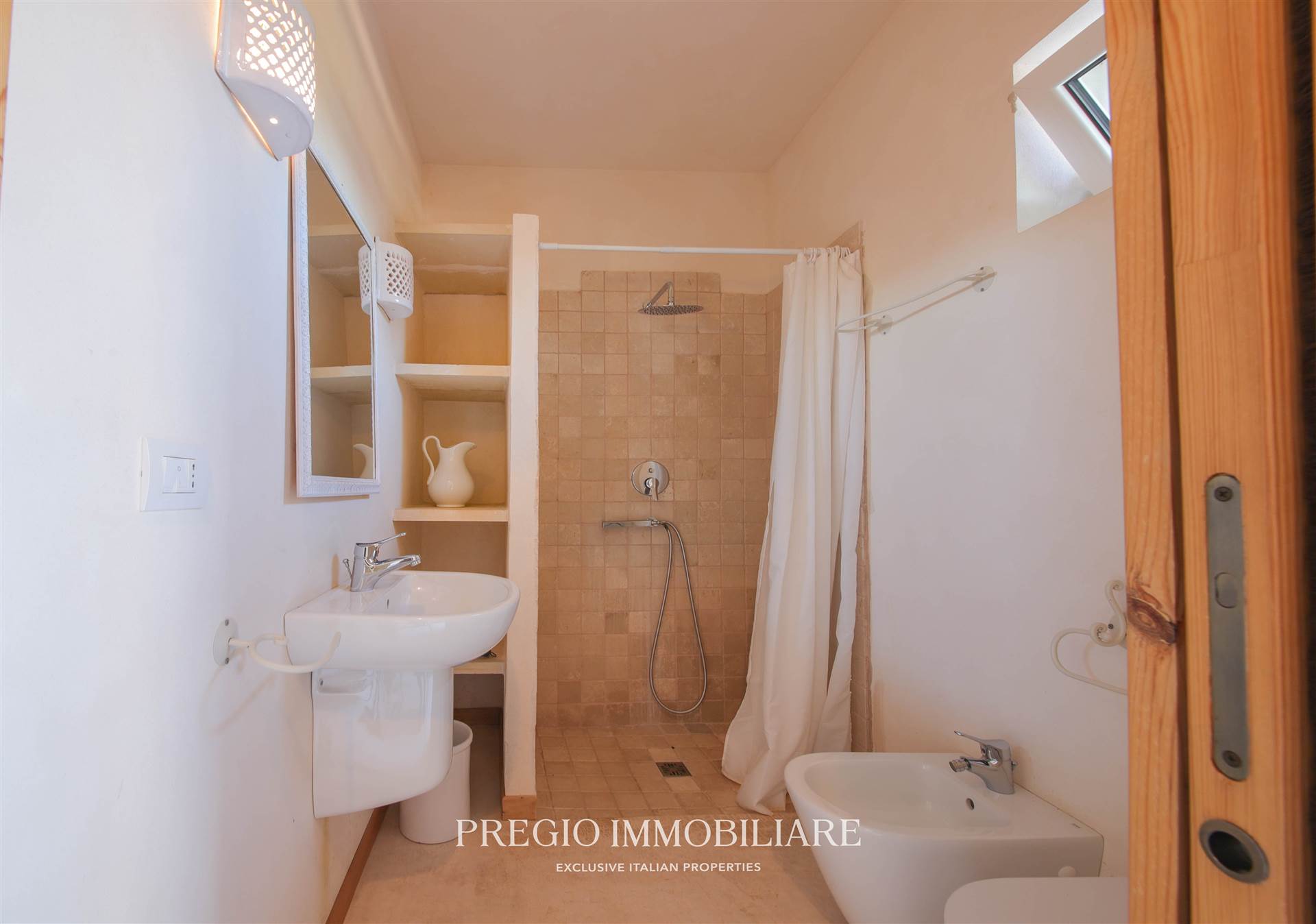 Una scala interna ed esterna conduce al piano superiore, dove si trovano altre due camere da letto, ciascuna con bagno en suite e spogliatoio. Da qui si accede a una straordinaria terrazza panoramica con vista mare, un autentico rifugio per momenti di relax, dotato di una cucina esterna e un’ampia area living, ideale per cene sotto le stelle.