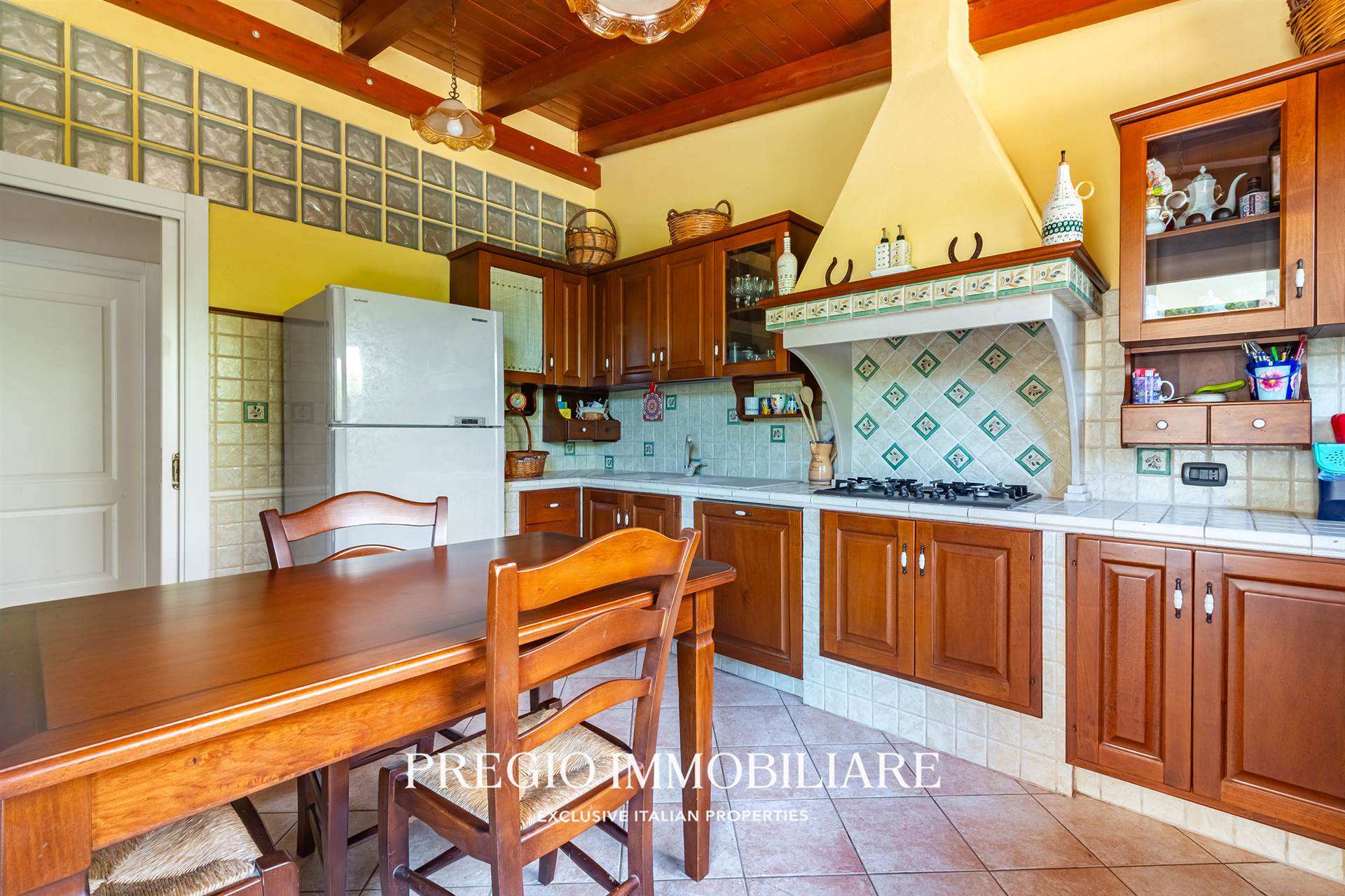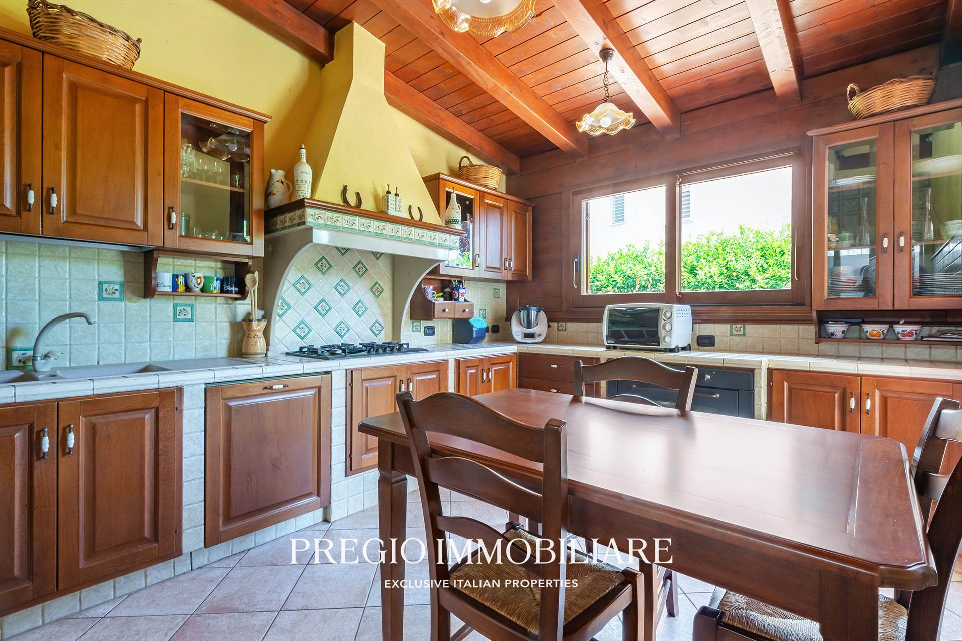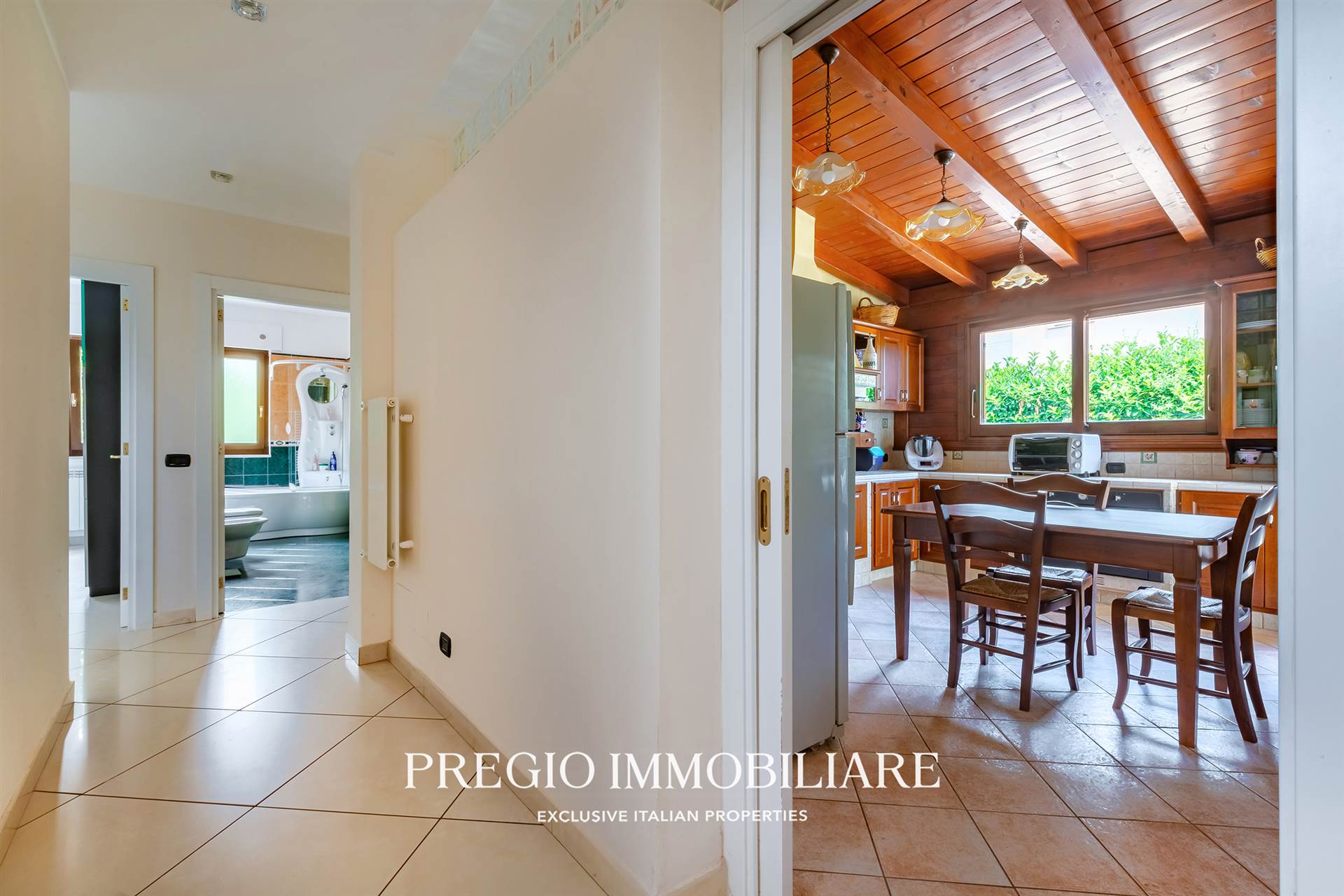 L’ingresso introduce in un salone di rappresentanza di 70 mq: ampio, luminoso, con affacci sul verde e spazi perfetti per vivere e ricevere. Adiacente, una cucina in muratura, abitabile, pensata per un uso quotidiano pratico ma con stile.