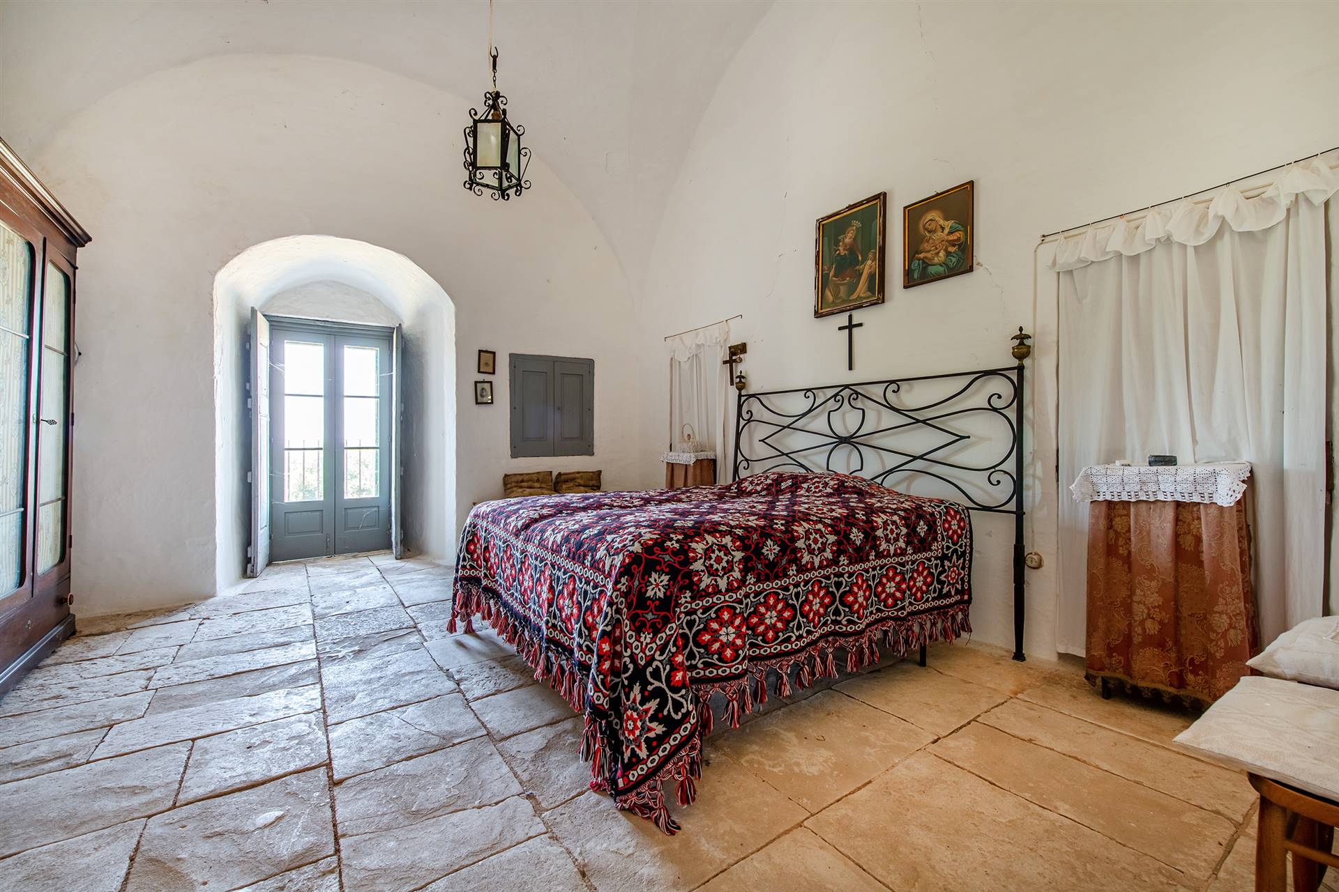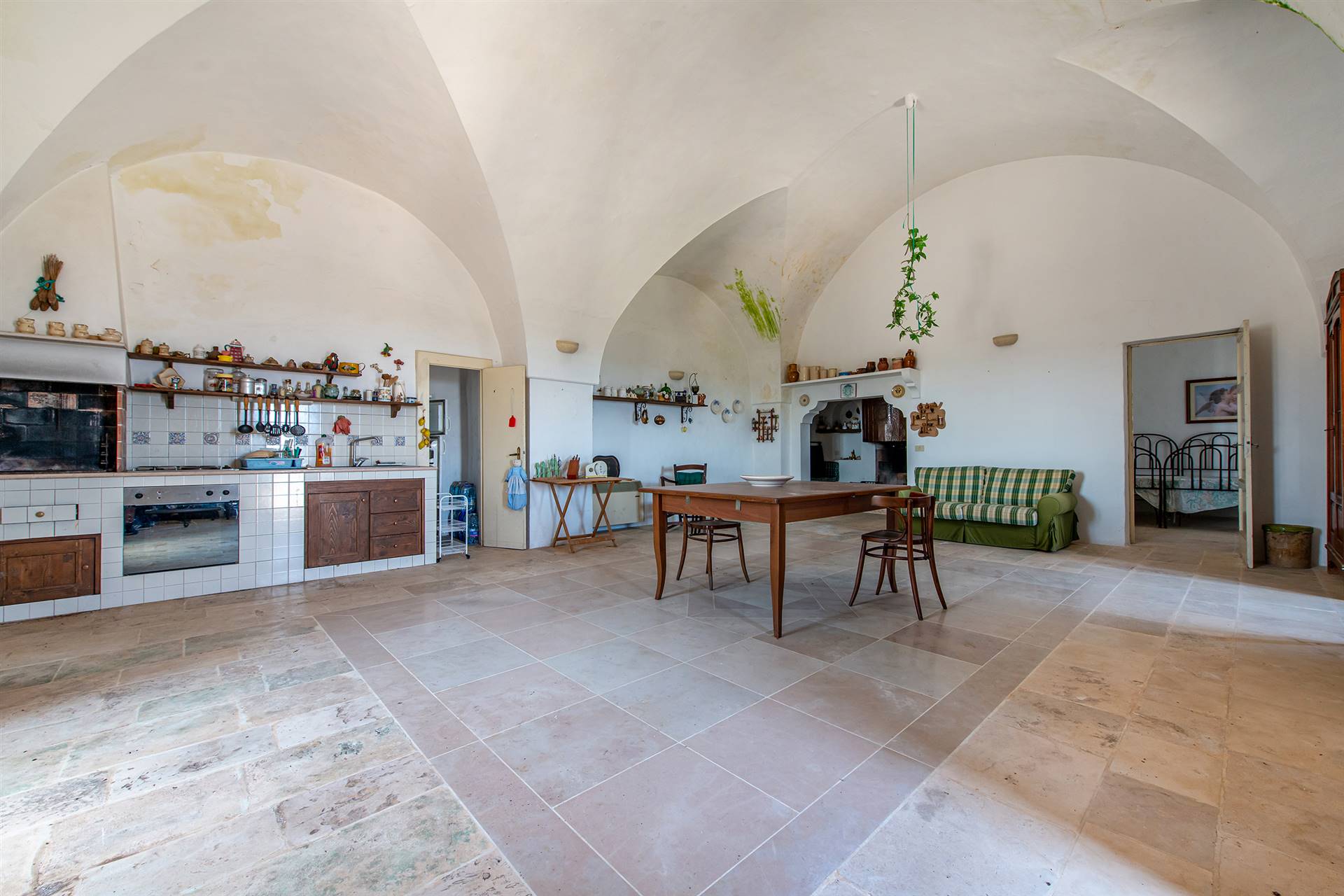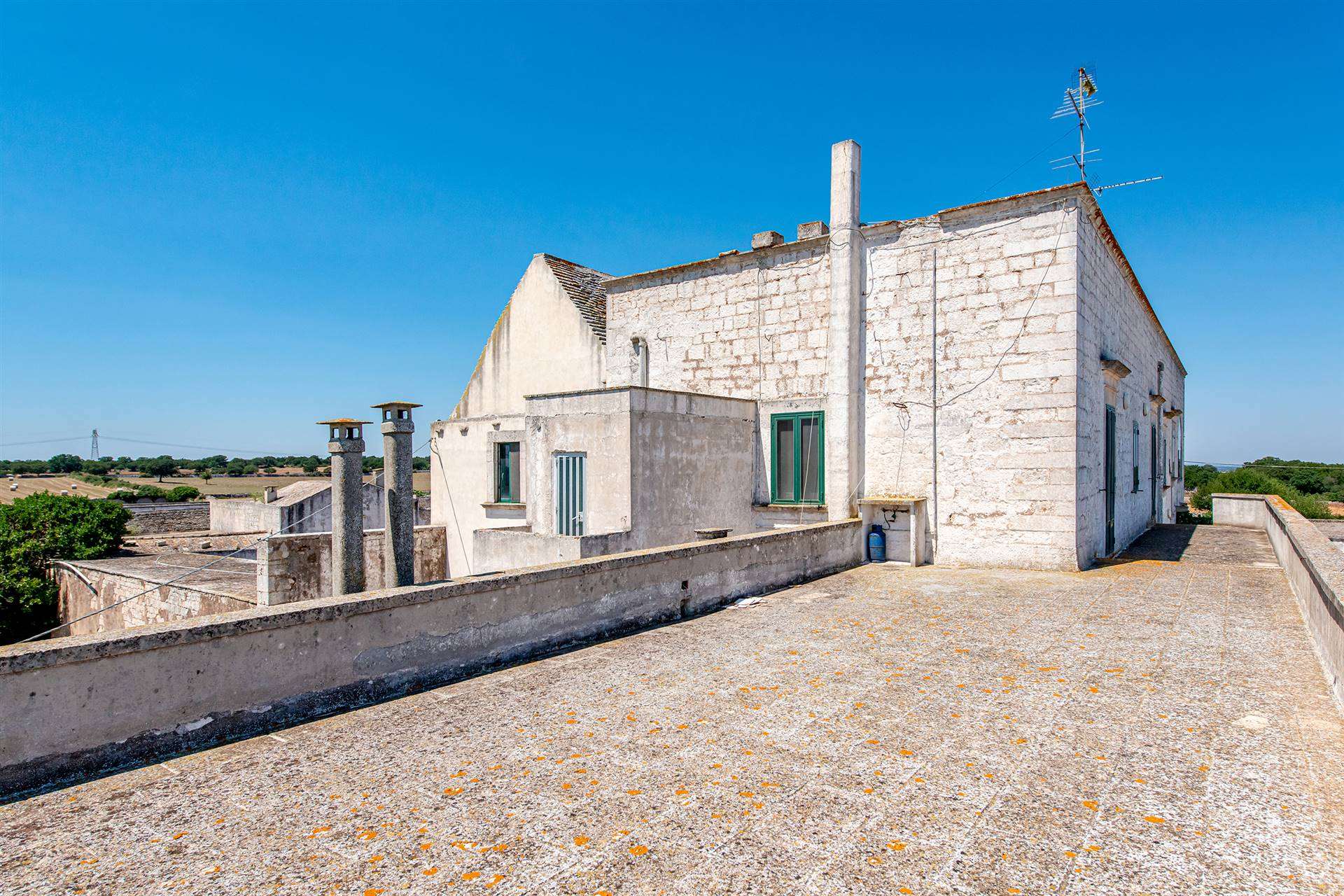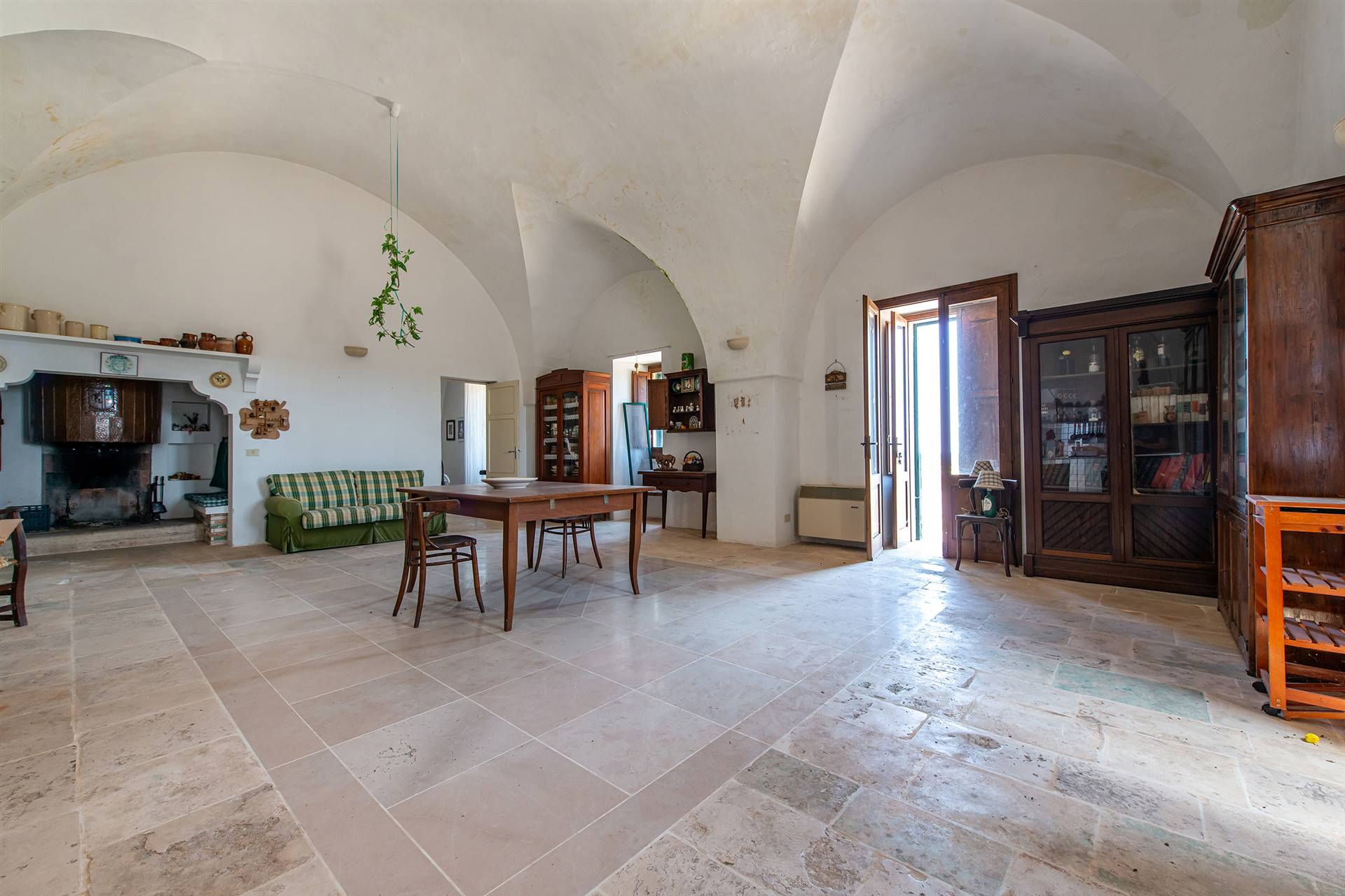 Tra la splendida zona della Valle D’Itria e dell’alta Murgia, precisamente nell’agro di Martina Franca in Contrada Ermellino, proponiamo in vendita antica masseria a corte del ‘600 con 20 ettari circa di terreno. La Masseria è della tipologia “a corte”, edificata tra il 1600 e il 1700 e rappresenta uno dei massimi esempi di storicità e bellezza anche in merito alla tradizionale suddivisione tra Area Padronale, ossia tutti gli ambienti destinati al proprietario e l’Area dei Servizi. Il complesso masserizio si sviluppa su due unità immobiliari disposte su due livelli. La prima unità è composta da: piano terra di 465 mq adibiti alle stanze della servitù con cinque camere da letto, bagno con vasca e garage. Il piano superiore nobiliare è composto da 350 mq con camera da letto, salone principale con camino, cucina e bagno. La seconda unità è composta da: piano terra di 589 mq con varie stanze ed ambienti e dal piano superiore di 158 mq con 3 camere da letto, saletta cucina con camino e un soggiorno veranda ad archie bagno. All’esterno troviamo ampio viale di ingresso, l’aia e un terreno piantumato di 20 ettari di seminativo. Elemento di rilievo è la pavimentazione con chianca originale. La posizione strategica permette di essere vicina sia alle città di Alberobello, Locorotondo e Noci e, allo stesso tempo rimanere a contatto con la natura. La disponibilità è immediata. Ideale ad uso investimento agricolo e turistico-ricettivo.